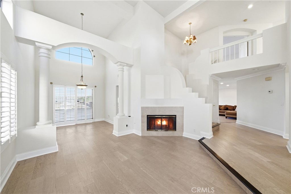 Nestled in the prestigious heart of Mission Viejo, this 4-bedroom, 3-bathroom masterpiece offers an unrivaled lifestyle just moments from the serene Lake Mission Viejo, premier dining, excellent shopping, commuting options, top-tier schools, and scenic hiking and biking trails. This rare jewel redefines luxury living with breathtaking, sun-drenched architecture, meticulous custom detailing, and panoramic views of city lights, green hills and Saddleback Mountain. Be welcomed by a serene, beautifully landscaped exterior featuring mature palm trees, custom lighting, and a tranquil fountain that anchors a welcoming conversational seating area. Step into a breathtaking, light-filled entry with soaring ceilings, engineered wood flooring, custom baseboards, neutral paint and designer finishes. The formal dining room features elegant custom columns sure to set the tone for your formal event, while the expansive family room features a striking see through triple-sided granite fireplace, which is shared with the eat-in kitchen and has direct access to the outdoor patio. Featuring warm and intriguing granite countertops, custom cabinetry, stainless steel appliances, and a serene view from the over the sink window, the kitchen will be the heart of the home with a dedicated eat-in space and the vibe from that fireplace. A convenient downstairs bedroom, an updated three-quarter bath and an inside laundry room with garage access completes the lower level. Upstairs the oversized primary retreat features a private balcony with sweeping views, a double-sided fireplace that leads into the spa-like ensuite which has been completely updated and hosts a sprawling granite dual sink vanity with a central seating area to indulge in your routine, a step in shower, a soaking tub that abuts the fireplace – the perfect spot for a relaxing soak by the fire, a private water closet and a sizable mirrored door closet. Truly a must-see space. Two additional bedrooms and an updated granite vanity guest bath complete the living spaces. Out back relax on the oversized, shaded deck with captivating unobstructed mountain views and enjoy ample space to play or entertain in seclusion with a wraparound set up allowing for multiple seating areas. This home is not just a residence; it is a lifestyle, offering the pinnacle of Orange County living in a highly sought-after, tranquil community. Welcome home.