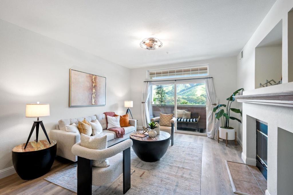 Welcome to this stylish, light-filled 2BD/2BA condo ideally situated within the community, overlooking the scenic San Bruno Mountains. Offered for the first time by the original owner, this beautifully updated home blends modern design with privacy and comfort.The spacious living room with dinidng area combo features wood flooring, a fireplace, and opens to a large private patio with serene mountain views is perfect for seamless indoor-outdoor living. The updated kitchen showcases refaced cabinetry, stone countertops, stainless steel appliances, and a kitchen nook.The primary suite offers a spa-like remodeled bath with a stall shower and direct patio access. A generously sized second bedroom is complemented by a full guest bath with a shower/tub combination. Additional highlights include LVP flooring, fresh interior paint, dual-pane windows, in-unit laundry with washer/dryer, updated lighting and ceiling fans, and two deeded garage parking spaces with ample guest parking. Enjoy resort-style living near parks, trails, shopping, SFO, and Hwy 101, a rare opportunity in a sought after neighborhood.