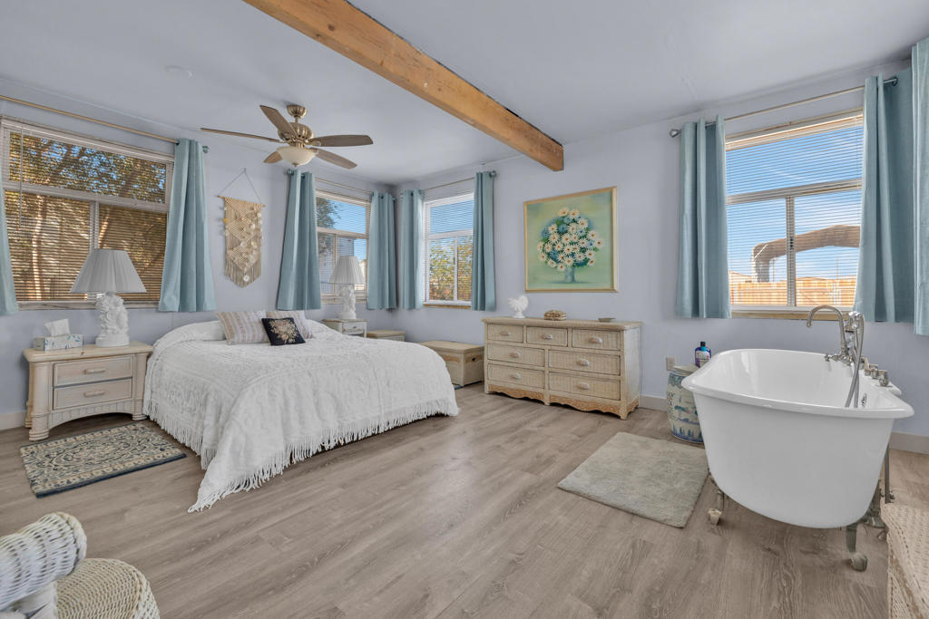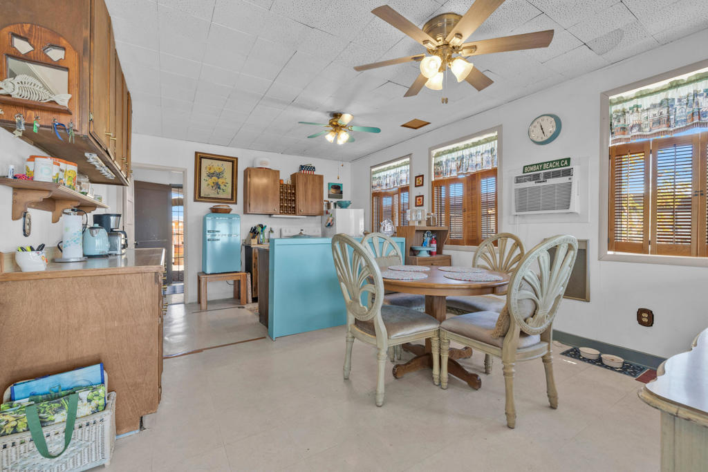Bombay Beach, Ca. 2180 3rd Street. Charming move in ready classic est. 1952-1960 California Bungalow for sale. Home is an absolute charmer, with lots of natural light, that has a comfortable/cozy feel. Lots of great windows and light throughout. Open concept kitchen and dining room with plenty of room for entertaining family or friends. Large living room area. Large bedroom features a new porcelain clawfoot bath tub. Perfect quiet getaway spot rustic chic decor embracing the past history and feel of what makes people fall in love with Bombay Beach. Seller has recently used home as an Air BnB. Home needs some cosmetic fixing but seller has done many upgrades like; newer flooring in living, bedroom and bath, new water heater, roof repair, irrigation, and installing the clawfoot tub. Home has a spacious front porch for entertaining and barbequing. Property is newly fenced with rear alley access. Large shed in back with washer/dryer and shelves for storage The area is popular with people from all over the world known for its gorgeous winter weather, long time weekend and second homes, off road enthusiasts and very popular with all types of the artist community who gravitate to this unique area. The home comes turnkey furnished with electric golf cart included. Sold As-Is, All information deemed reliable however buyer is to do their own investigations to satisfy themselves. Seller and/or agent make no warranties. Lower IID electric and CVWD water in the area.