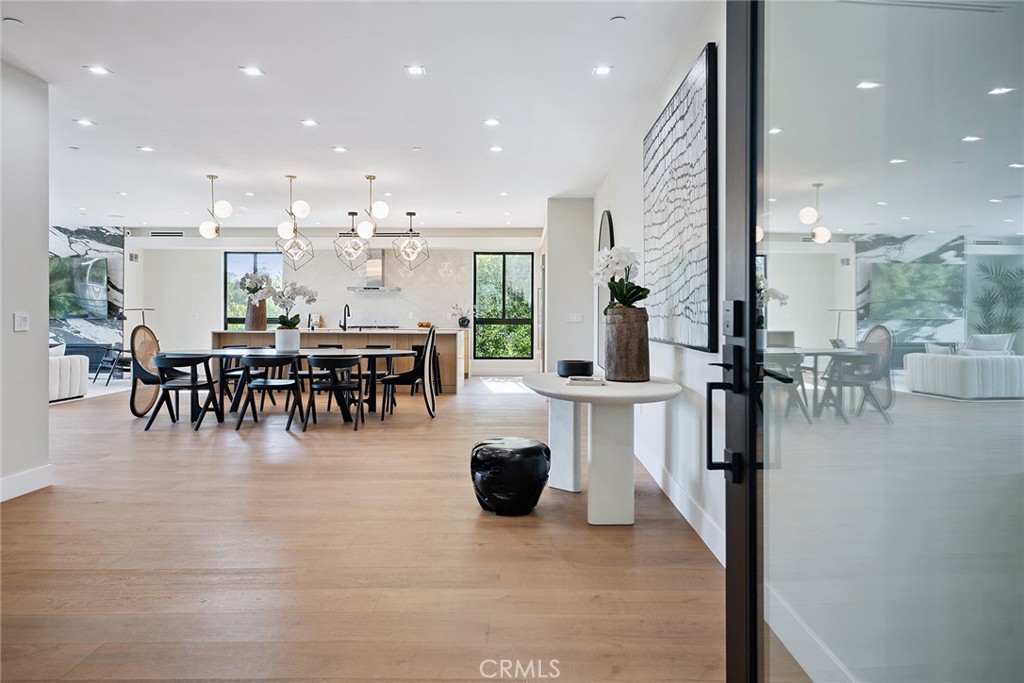 Gated modern estate newly constructed in 2024 with newly built pool & spa located South of the Boulevard with Valley, mountain, & city light views! Privately tucked away and hidden from the street, the property is situated down a long gated driveway with pedestrian access and flanked by tall growth hedging. Oversized parking can accommodate 10 cars plus there is direct access to an extra deep 540 SF 2-car garage. The interiors boast meticulous craftsmanship, designer finishes, and almost every room looks out to gorgeous views. A glass pivot entry door opens to a grand foyer where you’ll find a completely open floor plan filled with natural light from sweeping glass doors that open to the vistas beyond. The chef’s gourmet kitchen boasts massive center island with breakfast bar seating, stainless gourmet appliances, custom soft close cabinetry with quartz counters, separate wine fridge, and great pantry space. The kitchen opens directly to all living spaces including the formal dining room, the spacious family room with stone fireplace, and separate separate den – all rooms highlighted by glass pocket doors & sliders that open to a sprawling wraparound balcony deck with seating area that overlooks the amazing Valley & mountain views. A lower level movie theater has a full bathroom, access to the exterior, and can alternatively be used as a guest suite. Ascend a stunning floating glass and iron staircase to the upper level where you’ll find four well appointed bedrooms including the luxurious primary suite featuring stone fireplace, pocket doors that open to a balcony deck overlooking the gorgeous views, expansive walk-in closet, and sumptuous en-suite bathroom with custom floating vanity with dual sinks, designer tiling, walk-in steam shower with multiple shower heads, soaking tub, and separate toilet room. The three additional bedrooms have walk-in closets and access to their own bathrooms. Two of the rooms have large sliders that open to the backyard and the other opens to a large balcony deck overlooking the views. The resort styled backyard features brand new 2025 built pool and spa, large wraparound patio for lounging and outdoor dining, BBQ center, and grass lawns with lush landscaping. Desirably located adjacent to dining & shopping at the Calabasas Commons, Topanga Canyon shops/eateries, Westfield Topanga Mall/Village, Warner Center, hiking trails & minutes to Malibu.