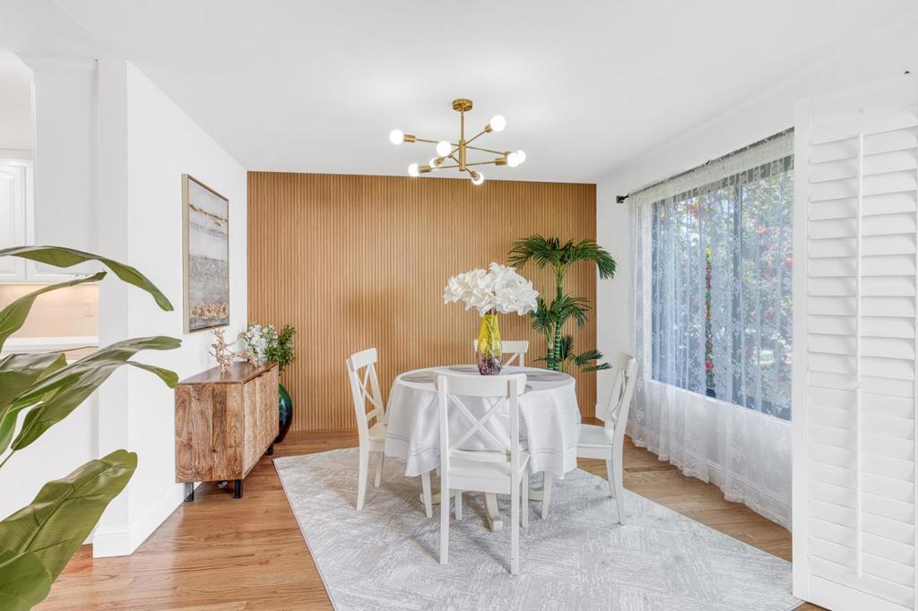 This majorly remodeled two-story corner townhome is truly move-in ready. The bright open floor plan features high ceilings on both levels, creating an airy feel throughout. The living and dining areas open to a private backyard through sliding doors, making it easy to enjoy indoor-outdoor living. Located at a corner within the community, the home benefits from extra windows and great natural light. Upstairs offers three light-filled bedrooms with vaulted ceilings, including a primary suite with its own private deck. The spacious kitchen has been remodeled with quartz countertops and quality brand appliances, offering both style and functionality. With 2.5 renovated bathrooms, central AC, hardwood flooring, and recessed LED lighting throughout, a fashionable chandelier, the home has been thoughtfully updated with a clean, modern look. The property includes a one-car garage plus a dedicated parking space. Conveniently located near major tech companies, Downtown Mountain View, Whisman Station, and Caltrain, with easy access to Highways 101, 85, and 237. Zoned for Mountain View High. A great opportunity in a desirable location.