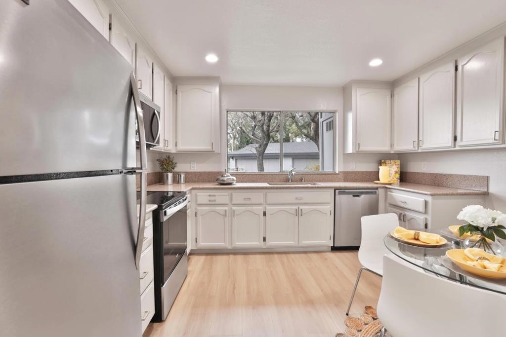 Beautifully updated townhome-style featuring complete interior paint, including refreshed kitchen and bathroom cabinets, plus modern touches throughout. Enjoy new laminate flooring downstairs, new carpet upstairs, and updated light fixtures with recessed lighting. The spacious kitchen offers ample counter space and stainless steel appliances, opening to a formal dining area. Cozy family room with fireplace. All 3 bedrooms are located upstairs, including a primary suite with a large walk-in closet. Outdoor spaces include a private balcony and a peaceful backyard. Community amenities include a pool, jacuzzi, serene fountain pond, and walking paths. Newly built garage adds convenience. Prime location close to major highways, shopping centers, and vibrant downtown Willow Glen.