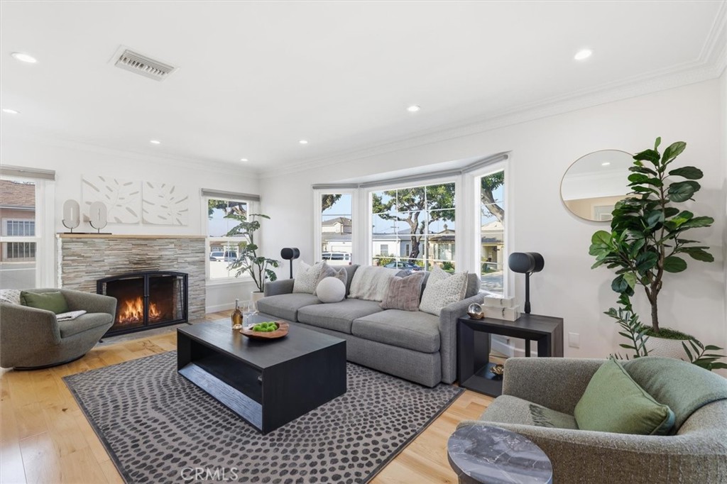 Nestled on a tree lined block in Inglewood’s Century Heights, this updated residence with a newly built detached two-bedroom ADU offers refined living with long term flexibility. Before moving in, the owner comprehensively rebuilt the main residence, addressing structure, systems, and finishes with a focus on durability and long term ownership rather than a cosmetic renovation. The main home features hickory hardwood floors, custom cabinetry, sound reducing triple pane windows, modern lighting, and central heating and air. Natural light and neutral finishes flow throughout, anchored by a living room with a built in fireplace and bay windows. The kitchen offers generous counter space, a center island with aqua quartzite, textured backsplash, and an adjacent dining area surrounded by windows. The primary suite includes sliding doors to the patio and a spa inspired bath with dual sinks, soaking tub, and separate shower. Two additional bedrooms, a guest bath, and a dedicated laundry room complete the layout. Recent system focused upgrades include replacement of the main water line, updated plumbing and electrical, roof resheeting and installation, and exterior restucco completed approximately nine years ago. The fully permitted ADU with no prior occupancy features an open living area, contemporary kitchen with quartz countertops and new appliances, vaulted ceilings, skylights, dedicated washer and dryer, multi zone mini split HVAC, and separate gas and electric meters. Outdoor spaces are secured by a gated entry and long driveway and include a private patio and lawn, along with a shared paved area with hot tub, above ground firepit, and storage shed. Conveniently located near major venues, beaches, shopping, LAX, and the 110, 105, and 405 freeways, this is a rare and compelling opportunity in Century Heights.