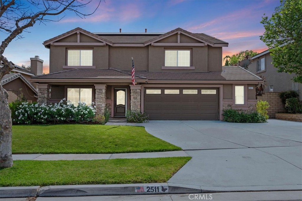 Beautifully upgraded two-story home with an incredible backyard featuring an in-ground pool, spa, and fire pit, perfect for entertaining. The main level offers a living room with a dining area, a family room with a coffered ceiling and a fireplace, and a half bath. The kitchen opens to the breakfast area and family room and features stainless steel appliances, including a microwave/oven, a kitchen island, and abundant cabinetry. There is also an indoor laundry room and direct access to the 2-car garage. Upstairs, the spacious primary suite features chair-rail molding, an en suite bathroom with dual vanities, a separate make-up area, a soaking tub, a separate shower, and a walk-in closet. The second level also features a loft, three additional bedrooms, and a hall bath with dual vanities. Additional interior highlights include upgraded flooring, ceiling fans, plantation shutters, recessed lighting, a PAID-OFF ELECTRIC SOLAR SYSTEM, a built-in interior and exterior sound system, and a whole-house/attic fan. Exterior features include a covered front porch, a covered patio, an automatic irrigation system, an expanded driveway, and more. Conveniently located near the 15 Freeway, shopping, and entertainment. NO HOA Dues and Low Taxes!