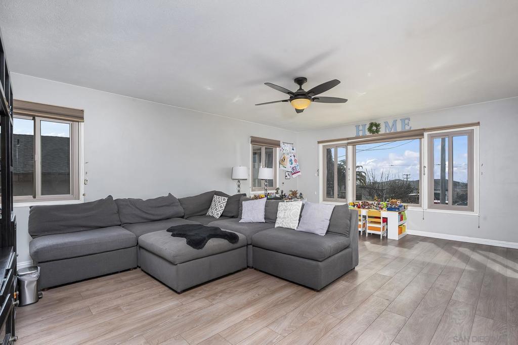 Perched at the top of a hill in Paradise Hills, this 2-bedroom, 1-bath home offers sit-down bay views from the living and dining rooms and panoramic mountain and city views from the backyard. Listed square footage includes a permitted enclosed bonus room with separate mini split, providing flexible additional living space. The spacious 9,300 sq ft lot features a meticulously landscaped front yard with water-wise drip irrigation and artificial turf. The backyard is ideal for entertaining and everyday use, complete with a large covered aluminum patio, garden beds, and play structure with turf. Interior features include newer central heating and air, dual-paned windows, LVP flooring with red oak hardwood floors underneath, and an upgraded bathroom with custom tile. There is a two-car attached garage with epoxy floors and overhead attic storage. Paradise Hills is an established residential neighborhood in southeastern San Diego known for its rolling hills and scenic views, including sights of San Diego Bay and surrounding mountains.