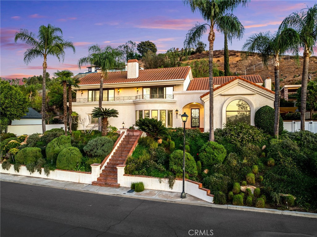 VICTORIA WOODS SOUTH- KNOB HILL ESTATES- stunning custom built Santa Barbara style Spanish Colonial home nestled on this elevated hillside site: Commanding views of Palm Tree lined Victoria Avenue, city lights, Mount Rubidoux, the downtown Riverside skyline and the snow capped mountains beyond. Timeless style and character abound in this thoughtfully configured home; Massive formal living room with dramatic wood beamed ceiling and large Palladian window and wood-burning fireplace; Generous formal dining room with coved ceiling; Expansive island kitchen with walk-in pantry, breakfast bar and all built-in appliances opens to the spacious family room with large circular walk-a-bay window and Inglenook Fireplace with wood stove; Ascend the wide stairs to the upper level bedrooms separated by the upper landing; Two family bedrooms each with a private ensuite bath are located at rear south end of the upper level; The primary suite enjoys the seclusion of the north front of the second floor where views are enjoyed from the adjoining terrace; Additional primary suite amenities include the luxurious bath and walk-in closet with direct access to the upper level laundry room; Also sharing the upper floor but accessible from the back stairs is the guest suite or bonus room with kitchenette, private bath and access to the laundry room; Oversized, attached three-car side loaded garage and large driveway parking area; The grounds are beautifully landscaped with mature shade and multiple varieties fruit trees and plantings amid multiple patios on varying levels affording ample outdoor recreation areas. Built-in swim spa and terraced orchard complete the rear portions of this secluded site; Fully integrated power solar shades protect the front windows of the residence from direct afternoon sun aiding in keeping the interior climate comfortable; Close to all schools, Victoria Club and just a short distance from the Riverside, Plaza, UCR, RCC and the 91 freeway! Offered for the first time in 30 years!