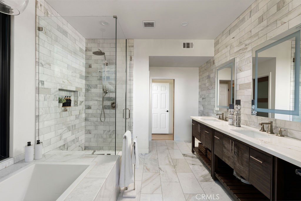 Welcome to this meticulously reimagined masterpiece nestled in one of Mission Viejo’s most coveted neighborhood and on a corner lot. This single story stunner went through a complete transformation. With nearly $500,000 in high-end upgrades and a 490 sq. ft. expansion, this home offers a seamless blend of modern sophistication and resort-style living, all framed by stunning Saddleback Mountain views. The unparalleled curb appeal sets the stage for what’s to come. Step inside to find a light-filled open floor plan featuring designer finishes at every turn. The gourmet kitchen is a chef’s dream, anchored by a large peninsula, professional-grade stainless steel appliances, and sleek marble countertops. The reimaged floor plan expanded the primary suite to a true sanctuary. Boasting a vaulted ceiling accented with wood beams, a custom built walk-in closet set behind custom pine pocket doors and a luxurious spa-like bathroom featuring high end marble tiling, deep soaking tub and large step-in shower. The home’s private backyard oasis is the perfect space for entertaining and relaxation. Enjoy the saltwater pool and spa that has all new equipment or relax under the pergola all with complete privacy provided by the redwood fencing. A variety of fruit trees bring abundance to the backyard. The garage is fully equipped to be an extension of the home as it’s fully insulated and has a committed mini-split. There is extra storage found at a pull down ladder too. Peace of mind comes standard with a full roof replacement integrated with a $40,000 solar system, an EV charging station, and $10,000 in electrical upgrades capable of running heavy power.No detail was overlooked, the home also includes all-new windows, doors, new HVAC & ducting, designer lighting, steel garage door and motor, LPV flooring throughout, and 2 solar attic fans. Possibilities of RV parking make this the total package. The home is zoned for Mission Viejo’s top rated elementary school and high ranking middle and high school. Additionally, the home enjoys access to the popular Lake Mission Viejo’s amenities and events. Every detail has been meticulously handled—from the structural engineering to the luxury finishes. Don’t miss a rare opportunity to own a fully-loaded one of a kind home in a prime location.