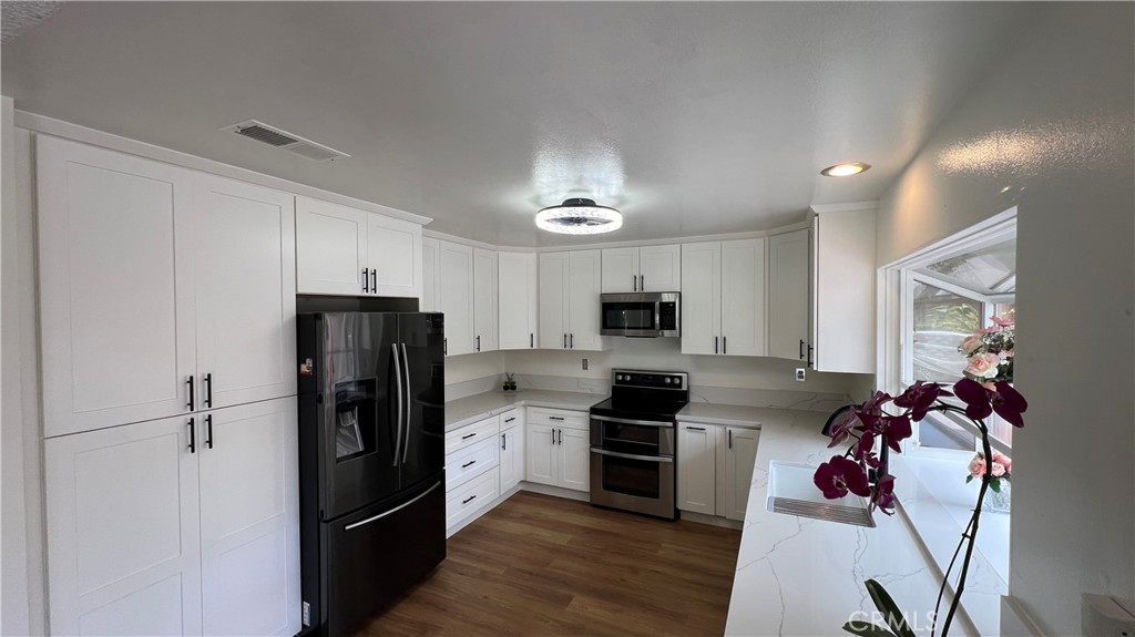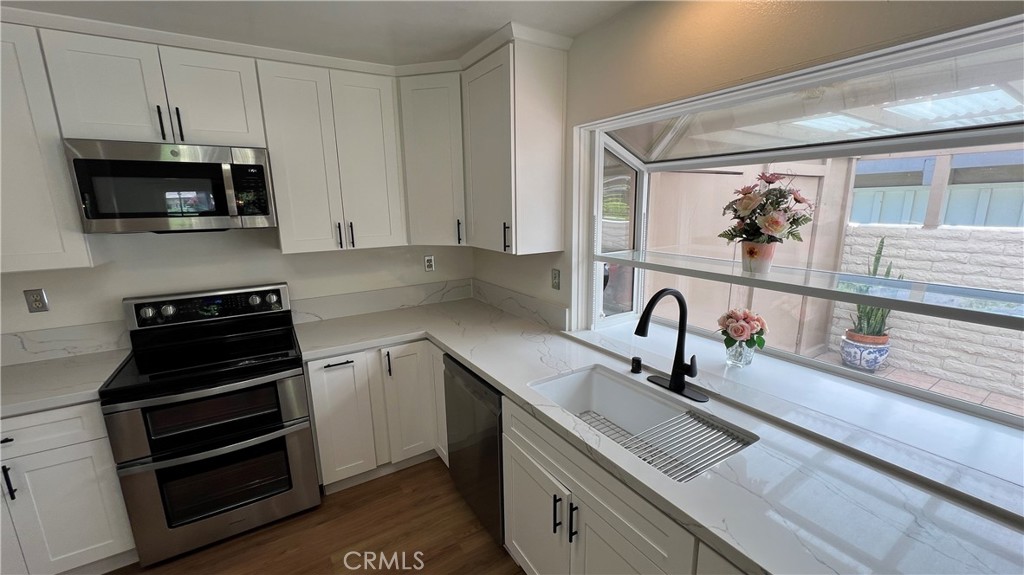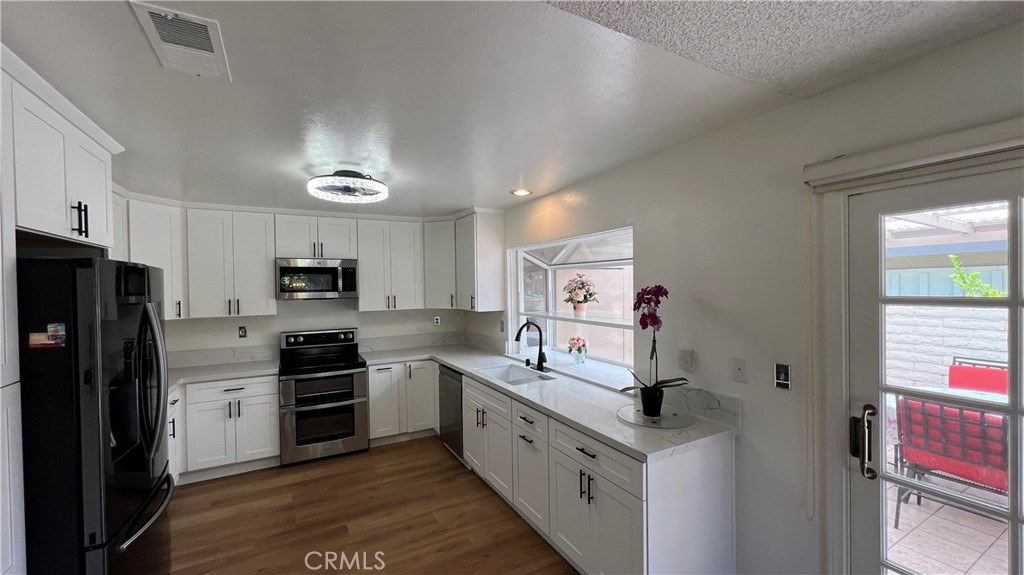 Charming 3-Bedroom Home in San Juan Hills West – Senior Community. Welcome to this beautifully updated single-level home in the highly sought-after 55+ community of San Juan Hills West. This spacious 1,680 sq. ft. residence features 3 bedrooms, 2 bathrooms, and is attached at only one wall, offering privacy and a tranquil living environment. Enjoy new laminate flooring throughout and a completely renovated kitchen with crisp white shaker cabinetry—perfect for modern living. The inviting floorplan flows seamlessly to two enclosed patios—front and back—providing additional space for relaxation or entertaining. The covered back patio offers peaceful greenbelt views, enhancing the serene, park-like setting. Additional features include central air conditioning, a two-car garage, and the convenience of an in-unit washer, dryer, and refrigerator—all included. Ideally located near historic downtown San Juan Capistrano, with easy access to shopping, dining, and major roadways, this home offers the perfect blend of comfort, convenience, and community.