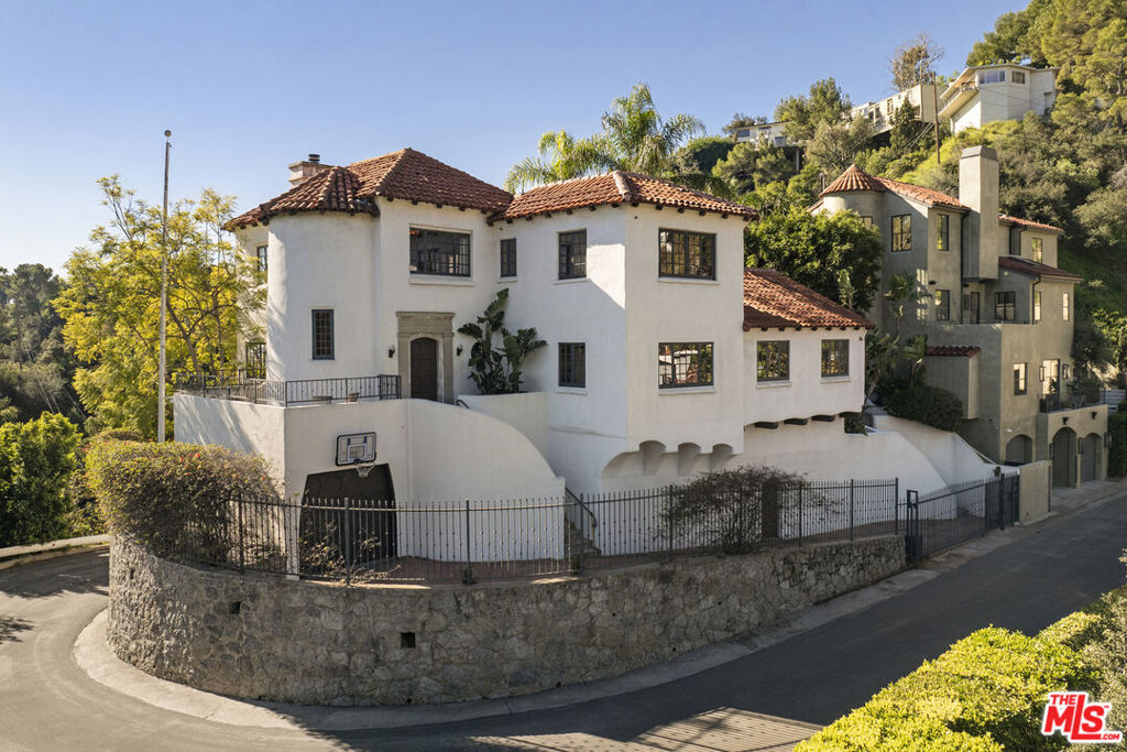 This gated circa 1926 Spanish Colonial Revival home with a rich historical pedigree, is one of Hollywoodland’s earliest and most distinctive houses. Designed by architect Elmer Grey (known for the Beverly Hills hotel and the Huntington Art Gallery), the property rises from historic stone walls to a commanding Beachwood Canyon promontory with spellbinding views of major landmarks – Hollywood Sign, Griffith Observatory and L.A. skyline to the ocean, in a neighborhood synonymous with the golden age of cinema and magical architecture. Notable features of the 5 bedrooms, 4.5 bathrooms property include a formal entry with original terrazzo floor and a graceful, curved staircase; well-preserved Malibu tiles throughout, vintage light fixtures and windows, and multiple patios, with a layout that harmoniously balances formal old world elegance and comfortable contemporary living. The main level has a spacious family room opening to a peaceful romantic courtyard with a wood-burning fireplace and a separate dining alcove; a formal dining room; a large kitchen with high end appliances and custom cabinetry; 3 perfectly positioned bedrooms; 2 baths and a classic powder room. Upstairs features a grand scale living room with coved ceilings and a carved stone wood-burning fireplace, opening onto a sunny patio; an exquisite original chapel/library with a 1920s Della Robbia wall fountain, original stained-glass windows and walls of built-in bookcases. The well-appointed primary bedroom with ensuite luxurious bathroom opening to a private balcony, and a walk-in closet, completes this level. Discreetly tucked below, an ideal guest studio with views has a private street entrance, a kitchenette and a bath. The verdant and tranquil setting compliments the home’s architecture and embodies the California lifestyle, offering optimum indoor/outdoor entertaining possibilities and expansive views from virtually every room. Glamorous and authentic architectural details have been thoughtfully preserved. This prized location on Belden Drive, near Beachwood Village market, cafes and shops, offers a calm oasis with utmost privacy.