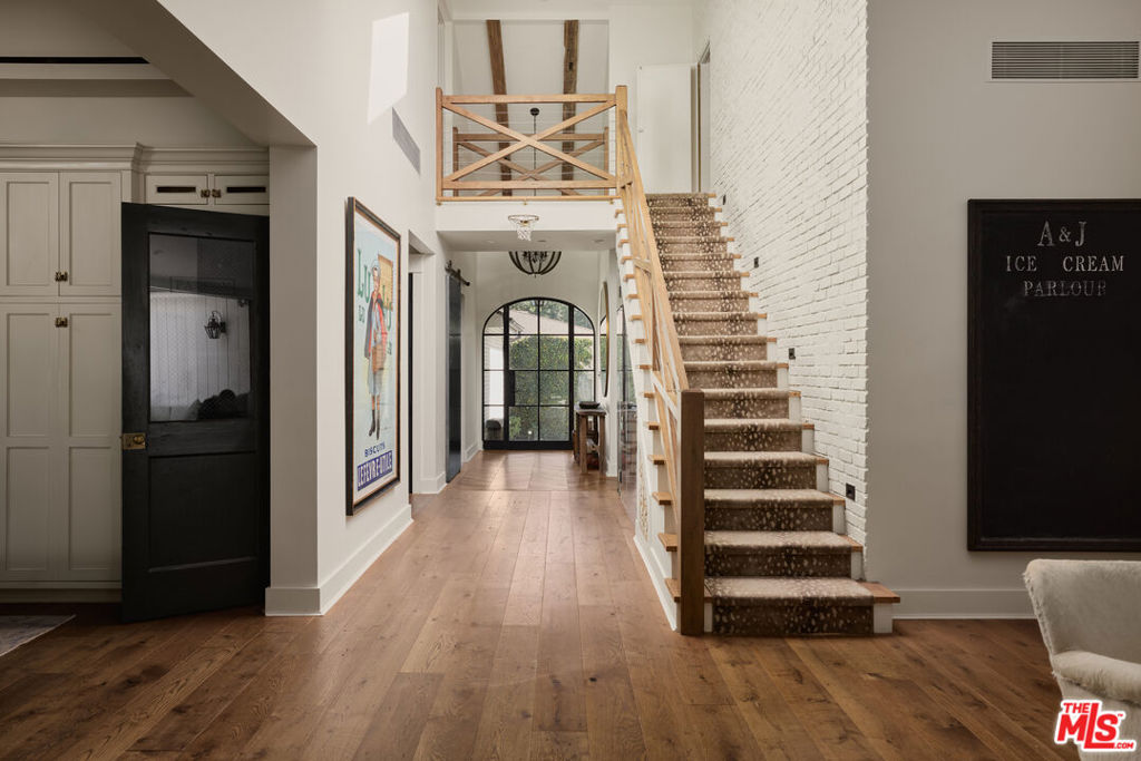 Welcome to this picture-perfect country farm house on an idyllic cul-de-sac, beautifully remodeled with moments tastefully curated for savoring all of life’s most wonderful comforts and pleasures. The limewashed tumbled brick facade is complemented by rustic lighting, exposed beams, a barn-style garage door, and porch swing set amidst manicured landscaping. Through the elegant arched glass-paned front door, discover wide-plank wood floors, lofty vaulted ceilings, and organic materials. With organization and space-saving top of mind, every section is thoughtfully optimized. The prize of the foyer is a quaint temperature-controlled under-stair wine store, encased in glass with an old-town feel. The delightful kitchen includes a large island with farm sink, Viking cooktop with hood and pot filler, Miele espresso, custom paneled refrigerator, bread box, and pantry, all accented by brass deVOL Kitchens hardware and fixtures. Nearby, enjoy family gatherings in the sunlit dining area. The European ski lodge-inspired primary suite includes an antique Tuscan farmhouse stone accent wall with fireplace, vaulted ceilings, plumbed coffee system, beverage refrigerator, and sitting area. Its en-suite bath is appointed with a dual-sink vanity, separate soaking tub, oversized rainwater shower, and bay window ledge, while the custom walk-in closet features numerous built-ins. The family room opens to the outside via sliding pocket doors, perfect for indoor-outdoor flow and an al-fresco ambiance. There is also a den/gaming lounge with a speak-easy-style bar as well as a media/television room. Secondary bedrooms and bathrooms are also well-done and light-filled, and they are even equipped with charming day swings for the young at heart. The finished attic has been transformed into a secret hideaway for story time and sleepovers! Modern conveniences and fine details found throughout include authentic French oak floors imported from the Lorraine region, all century-old solid wood beams, Forbes & Lomax switch plates and toggles, and five HVAC systems for optimum climate management. In the backyard, roam and play on the grassy lawn or relax on the sprawling patio. If desired, there is also room for a pool. This fantastic lower Nichols Canyon location in the Hollywood Hills is central to all, close to film studios and just moments to hiking trails, iconic landmarks like the Hollywood Bowl, the Valley, downtown LA, and the Westside.