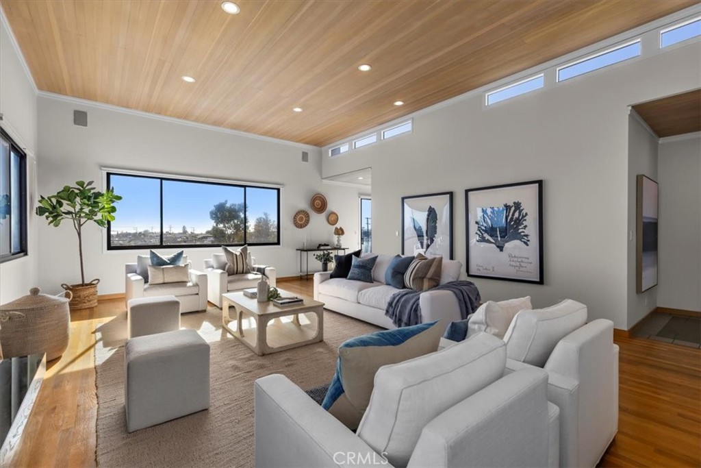 Located on one of the best streets in highly sought-after North Hermosa, this is the first time this incredible home has ever been on the market. This beautiful mid-century modern, custom built property is nestled on a rare cul de sac with west facing ocean views. It is immaculate and timeless, featuring soaring high ceilings complete with wood tongue & groove. This home was built ahead of it’s time, with a family friendly reverse floor plan that you would see in today’s new construction homes and an open-concept layout that is bathed in natural light. The top floor maximizes the ocean views and the beach breeze and has a gorgeous and spacious living room, dining room, and a professional grade kitchen with a newer stainless SubZero, a center island, breakfast nook and custom made solid wood cabinetry. There is also a deck off the living space that is perfect for enjoying coffee or cocktails at any time of day. There is also an additional room on the upper level that is a perfect office retreat, additional family room or could be used as a bedroom. The downstairs level features 3 other spacious bedrooms including the private master suite, and an incredible light and bright recreation room that could be utilized as a study room, a playroom, art room or additional casual family room space. Just outside this downstairs living space is an incredible yard with plenty of space to relax, sun, and enjoy. There is also an oversized laundry room on this level and storage space. This home places you just blocks away from the beach, vibrant dining and outdoor recreation. It is perfectly centered between downtown Manhattan Beach and downtown Hermosa Beach. Across the green belt, Valley Park provides the perfect setting for outdoor activities, family picnics and community events. This home has proximity to award-winning schools, including Hermosa View Elementary, Hermosa Valley School and Mira Costa High School, all known for their top-tier academics and exceptional educational programs. This is more than a home, it’s a legacy property of rare distinction, an offering that won’t last.