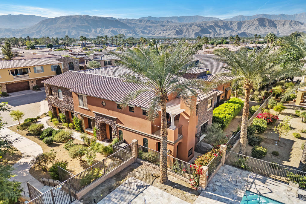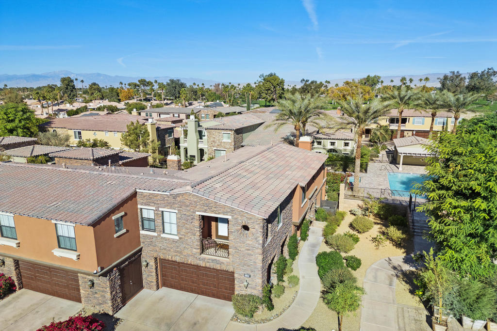 Welcome to the Tuscan inspired community of Brava centrally located to shopping, Eisenhower Medical Center, El Paseo, restaurants and entertainment. This exceptional townhome is highly upgraded such as custom built-ins, decorative paint colors, special window treatments and media center. As you enter the home you are welcomed by the beautiful tiled floors in the elegant rotunda foyer. An inviting living room opens to the well appointed chef’s kitchen featuring stainless steel appliances (new refrigerator and dishwasher), granite countertops, a walk-in pantry plus a breakfast bar. Connected to the kitchen is the dining area with a door leading to the downstairs patio with a dual-faced fireplace. Also, on the main floor is a guest room/office, a full bath, a laundry room with sink and plenty of storage with direct access to to the spacious garage. The staircase with its decorative wrought railing leads upstairs to a study area plus 2 split primary bedroom suites both of which have gorgeous bathrooms. One of these primary suites has a walk-in closet and a glass door which leads to the balcony and another outdoor fireplace overlooking the pool area below. This stunning townhome also features a 2-1/2 car garage with a nice oversized driveway easily accommodating 2 additional cars. The amenities of this community also include two pools/spa’s one of which is updated and next to this home, a clubhouse and low HOA’s. This home offers a rare blend of tranquility, comfort, convenience and value.