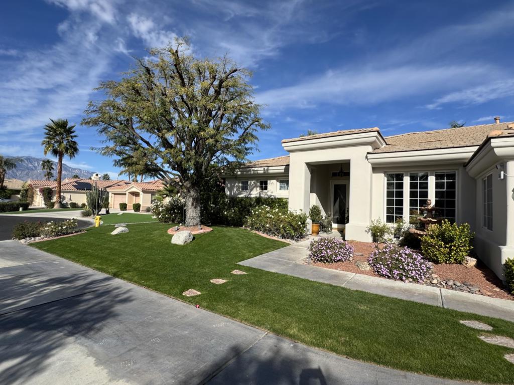 This remarkable 3-bed/2.5-bath/office home, 2129 SF, is the perfect place to embrace the desert lifestyle. It features a private backyard and patio with a pool and spa featuring Pebble Tech and a salt system, rose bushes, and fruit trees to cool off and enjoy the summer heat and festivities. Additionally, the house is equipped with a solar system and a Tesla battery, both completely paid off, has a 3-car garage, and sits on a cul-de-sac. The layout is a modern, open floor plan that highlights split bedrooms and a breakfast bar with easy access to the living room and home office. It also features stainless steel appliances, newer granite countertops, a newer sink and garbage disposal, newer lighting over the island area, newer washer and dryer, and a newer paint job throughout. Additionally the exterior of the house has been freshly painted. This house is situated in one of Rancho Mirage’s most desirable gated communities, La Terraza, which has low HOA fees and is centrally located between the I-10 freeway, Hwy 111, Eisenhower Hospital, El Paseo, The Shops at Palm Desert, restaurants, and other key areas, and is ready to move in. Come see this stunning house today!