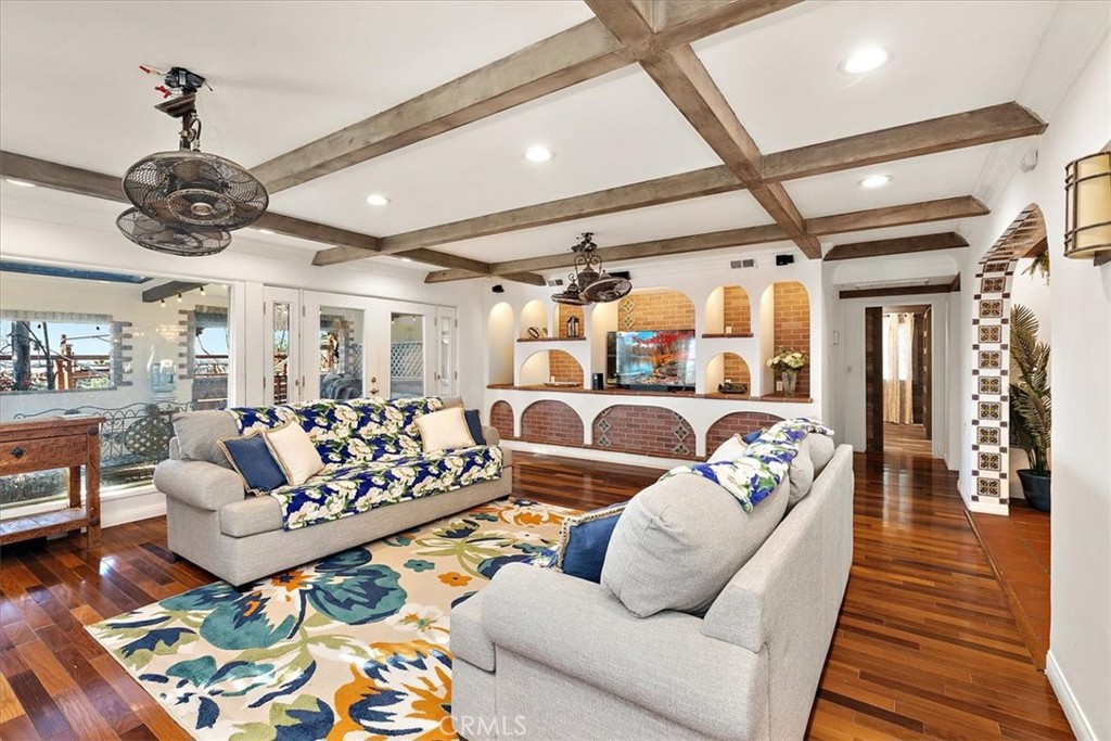 Secluded from the street behind a privacy fence, this stunning property is surrounded by an eco-friendly landscape highlighted by expansive Spanish terracotta tile pavers throughout the grounds. The home offers 4 bedrooms and 2 bathrooms, along with two well-appointed horse stables and a pen, making it ideal for equestrian enthusiasts. Step outside to a resort-style pool and spa, complete with a separate jacuzzi. The pool area is framed by elegant Roman pillars and classic terracotta Spanish tile. One side features the spa, while the opposite side offers a large pergola with a comfortable sofa and lounge area, perfect for entertaining or relaxing in privacy. Inside, the home is filled with natural light and showcases wood-beamed ceilings throughout, adding warmth and architectural character. The living room features rich wood flooring, a gorgeous brick fireplace, and a striking architectural feature wall with a red-brick backdrop, arched wood accents, and a dedicated space for a TV. An arched doorway accented with Spanish tilework leads into the dining room, seamlessly connecting the living spaces. The galley-style gourmet kitchen is designed for both function and gathering, offering a long center island that doubles as a full family dining bar, abundant storage, generous countertop space, a commercial-grade stove with griddle, and a large sink with dual faucets. The three secondary bedrooms are generously sized, with one featuring its own private bathroom and walk-in closet. The primary suite is a true retreat, boasting an elegant sitting room, a dual-sided fireplace, and a luxurious primary bathroom that is a masonry masterpiece. The bath is accented with a wood slab floating countertop and shelving, along with a custom wood slab shower bench supported by artistic wrought-iron legs. This home blends timeless Spanish design with thoughtful modern amenities, creating a private, resort-like sanctuary unlike any other.