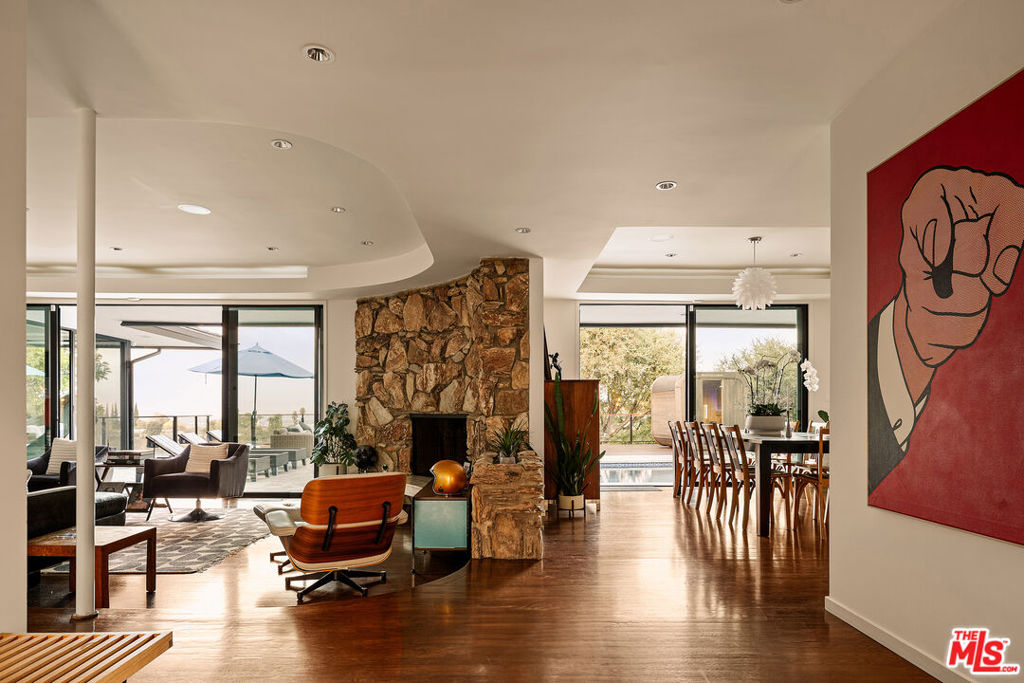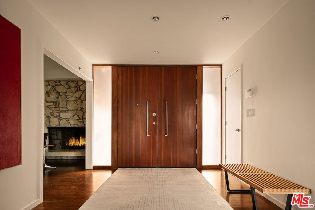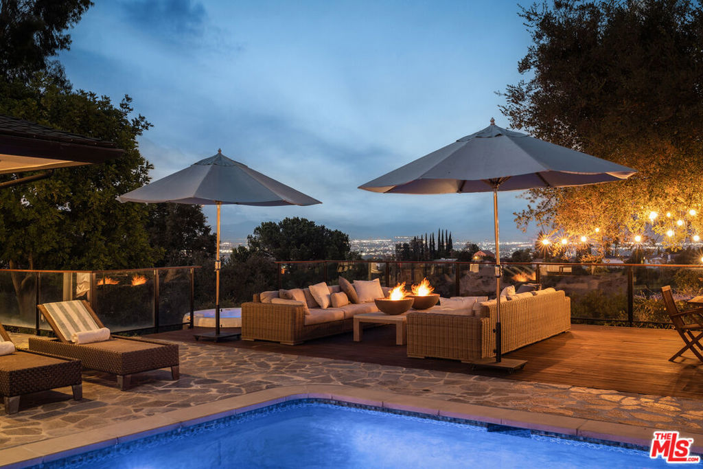 Tucked away in the highly coveted Encino Hills, just north of Mulholland Drive, this meticulously restored mid-century masterpiece inspired by Cliff May’s serene aesthetic, offers 5 bedrooms, 4.5 bathrooms, and expansive city and mountain views from nearly every corner. Situated on over half an acre in a peaceful double cul-de-sac, the home seamlessly blends classic design with modern elegance. Inside, the thoughtfully designed layout features two original stone fireplaces in the large living room, and media room. The kitchen stands out with Caesarstone countertops, custom walnut cabinetry, and high-end Thermador appliances, while oak floors flow throughout the residence. The primary suite is a true sanctuary, offering sweeping valley views and an opulent en-suite bath with heated floors, a glass steam shower, and a sunken jetted tub. Fleetwood floor-to-ceiling doors and windows extend the space into the horizon, and the home’s 7 skylights fill it with an abundance of natural light. Every bedroom boasts multiple custom closets, while all ensuite bathrooms are adorned with top-of-the-line Ann Sacks tiling, and handmade custom tiles in the kitchen and half bath. While the design honors its mid-century roots, the home is filled with modern day tech including 56 owned solar panels, automated sound, smart thermostats, and lighting, plus advanced alarm and security camera systems. The outdoor space transforms into an oasis of relaxation and entertainment. A large saltwater pool, jacuzzi spa, and Mangaris wood deck meet the horizon, offering breathtaking views of sparkling city lights. The residence also includes a sauna, a fireplace lounge, and an al fresco dining area perfect for hosting under the stars. Located south of the boulevard, this home offers easy access to freeways, dining, shopping, hiking trails, and nightlife, embodying the perfect blend of tranquility and convenience in one of LA’s most desirable neighborhoods. Just minutes to the Westside, and Mulholland corridor private schools, yet also in the acclaimed Lanai school district – your kids can have it all too!