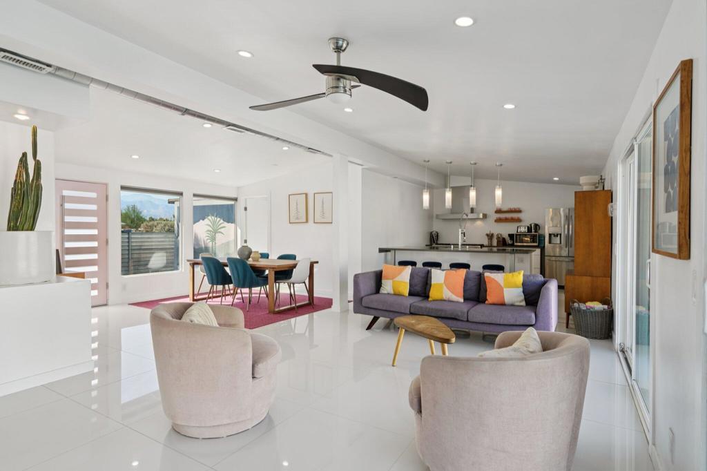 Fully remodeled and TURN-KEY, this vibrant mid-century home is move-in ready and waiting for you to start living the Palm Springs dream! Tucked away at the end of a quiet cul-de-sac and just minutes from the excitement of Downtown Palm Springs, this ultra-chic, fully updated 3 bedroom, 2 bath, 1,750 SF home is the ultimate desert retreat–and an incredible SHORT TERM RENTAL opportunity! Set on a massive west-facing lot with stunning San Jacinto Mountain views, this property is designed to impress inside and out. The backyard is a true oasis, complete with a sparkling heated saltwater pool and spa, built-in BBQ, ample poolside seating, and a private fire pit–perfect for unforgettable gatherings under the desert sky.Step inside to sleek, modern design blended with rich textures and nods to the home’s original mid-century roots, now refreshed with all-new amenities for today’s lifestyle. The chef’s kitchen is a showstopper, featuring high-end stainless steel appliances, a spacious eat-at island/bar, and an open flow into the great room–ideal for entertaining. Each bedroom is stylishly designed and filled with natural light, creating warm and inviting spaces throughout the home. The expansive primary suite is a true retreat, featuring direct access to the pool, a sleek wall-mounted fireplace for a cozy ambiance, and a show-stopping en-suite bath. The bathroom is finished with modern, high-end details, including a seamless walk-in shower with floor-to-ceiling tile, penny round tile floor, a wall-mounted toilet, and polished chrome fixtures–delivering both luxury and sophistication. With peak season rental rates around $450 per night, this property isn’t just a home, it’s a lucrative investment opportunity and a dream vacation destination all in one. Whether you’re looking for a high-performing short-term rental, a desert getaway, or a stylish year-round residence, this Palm Springs stunner checks every box!