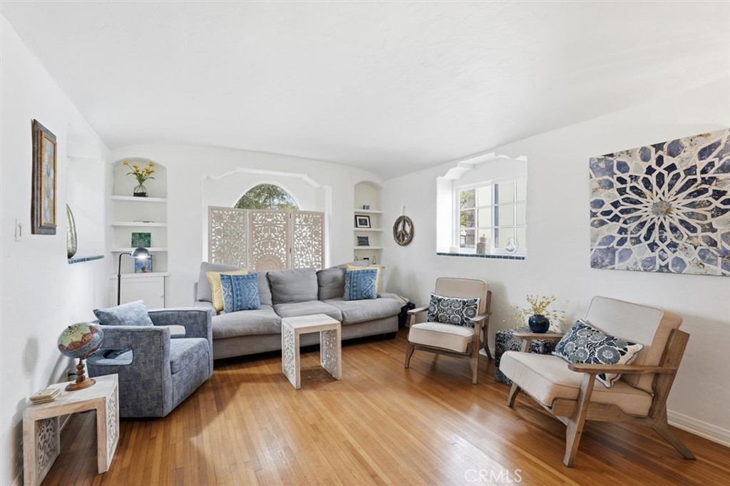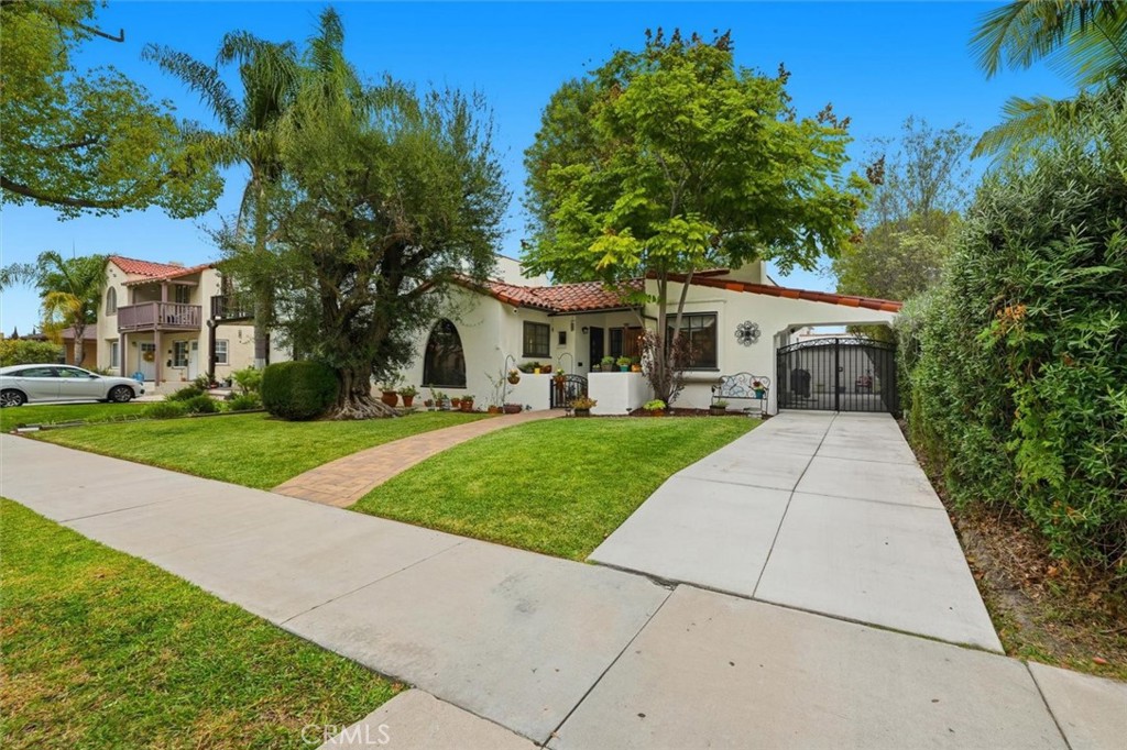 Ensconced in the historic California Heights community, this beautiful single-story Spanish home blends timeless character with comfortable living. A brick walkway and welcoming front porch lead to a gorgeous entry door, opening to warm hardwood floors, original built-ins, and arched windows that showcase period charm. The spacious living room with abundant natural light and faux fireplace is a perfect gathering place. The open dining area and kitchen, with terra cotta tile flooring, lovely blue tiles, top-of-the-line appliances, soapstone countertops, farmhouse sink, generous cabinetry and a charming breakfast nook flows into the family room with French Doors that lead to the back patio. Ideal for cooking, everyday living and entertaining. This home features 3 bedrooms(One bedroom is currently used as a Family Room) and a charming bathroom with classic tile and finished with period appropriate details. Step outside to a true backyard oasis, with a raised deck patio, ample space to gather, and a large green yard to enjoy year round. Additional highlights include central heat and laundry in the garage. An unbeatable location, this home is walking distance to Longfellow Elementary, Hughes Middle School, and the eclectic shops and eateries of Bixby Knolls.