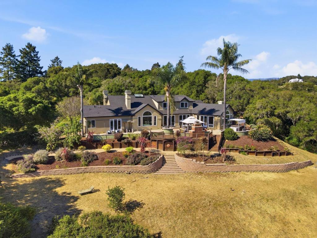 Welcome to the exclusive Mockingbird Ridge neighborhood, a stunning hilltop home with mountain views and ocean peeks. A beautifully landscaped front leads to the formal entry that opens to the living room with sweeping views, one of four cozy fireplaces. In the dining and kitchen, La Cantina doors bring the outside in. A wine bar with fridge, island for 10, and a chefs kitchen to delight any cook: 48″ Viking gas range, pot filler, Wolf double ovens, 2 Fisher & Paykel dishwashers, 2 sinks with Grohe faucets, Miele fridge, built-in espresso maker, pantry, and an eat-in area. The separate family room includes a wet bar, floor-to-ceiling windows, river rock fireplace, and access to the patio with hot tub, fireplace, and garden. The ground-floor primary features high ceilings, access to the patio, and updated ensuite. Also downstairs: guest room, full bath with steam shower, office with fireplace, laundry with sink, half bath, and wine room. Upstairs are two more bedrooms and a updated double sink bathroom. New roof, Anderson windows and new exterior and interior painting. This home sits on 11+ acres, with lower property access from Race Horse Ln. Close to Seascape Resort and fwy. Zoned special use, buyers to explore possibilities: vineyard,horses, etc. Don’t miss out on this one!