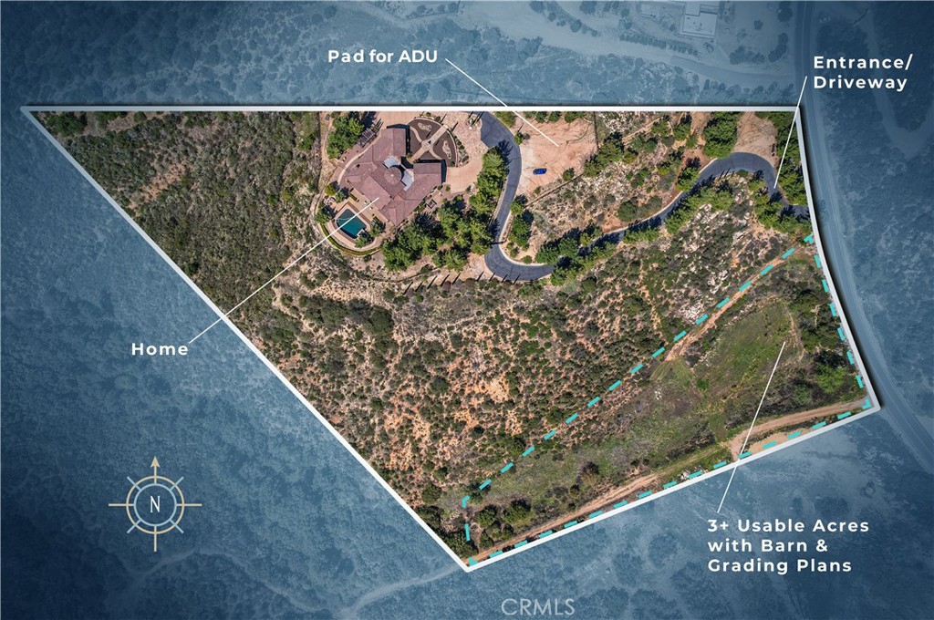 UTMOST PRIVACY & STUNNING VIEWS FROM THIS 10-ACRE SINGLE-STORY ESTATE IN LA CRESTA! Even has room for horses with submitted barn & arena plans! This single-story Showstopper is a “WOW” from the jump! From one of the best streets in La Cresta (Vista del Bosque means “View of the Forest”), the long private tree-lined driveway leads you to an automatic entry gate, accessing this magical estate. Notice the abundant use of natural stone (quarried from the property), as you head toward the custom iron front door and into the vaulted entry, where you will immediately be greeted, through a wall of glass, by the inviting resort-style pool and unobstructed panoramic mountain views. At dusk, as the sun sets over the Cleveland National Forest, the color palette goes from daylight to every imaginable shade of lavender. With views from every room in the house, the inside of this Italian-inspired home will not disappoint. Find 10–22-foot ceilings, all ensuite bedrooms, 8-ft solid doors, spacious great room, separate media room, wet bar, and a chef’s kitchen with 4 dishwasher drawers, & massive eat-around island. One of the two garages has been tastefully converted to a spacious bonus room, to be used how you like (currently is a game room). The grounds are very interesting with varying elevations, walk paths, gardening pavilion, RV parking pad and wood fencing. The pad adjacent the house is plenty large enough for an ADU or workshop, and the bottom 4 acres, already stubbed for power, has views of the forest and abundant flat land to create a dream horse or farm area. Views like this are one in a million. Add the immaculate, high-quality, dramatic, private estate, and you have a formula for a STUNNING FOREVER HOME! *****SANTA ROSA PLATEAU: 5-acre minimum parcels (10-acre minimum. in SR West), just minutes to schools, restaurants, hospitals, grocery stores, 15 Fwy & Temecula Wine Country. Enjoy this peaceful ranch community w/no commercial businesses, robust social activities, miles of private community trails & 1000s of acres of Ecological Reserve…All less than 1.5 hours from LA, SD, OC, Palm Springs & Big Bear. Discover the country, yet convenient, lifestyle of La Cresta, Tenaja & the Communities of the Santa Rosa Plateau!