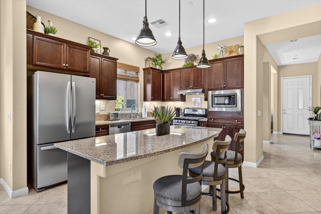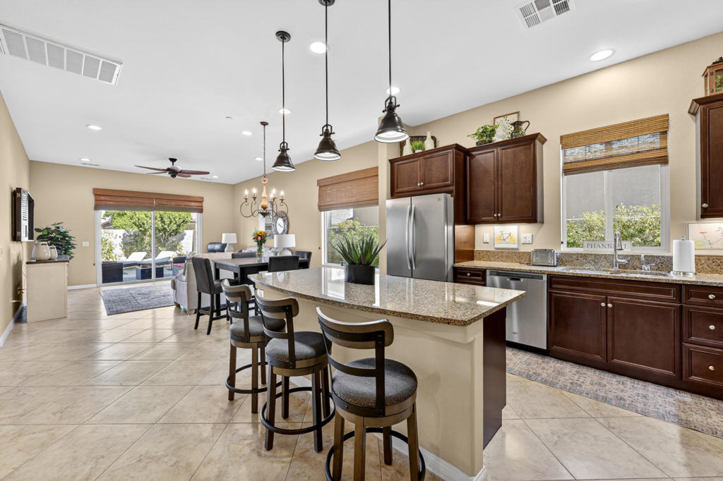 Welcome to Sun City Shadow Hills, where easy desert living meets comfort and style in this beautifully maintained Hideaway floor plan offering 1,512 square feet of thoughtfully designed space. This popular layout features 2 bedrooms, 2 bathrooms, plus a versatile den, ideal for a home office, hobby room, or additional guest space. From the moment you step inside, you’ll appreciate the elegant diagonal tile flooring throughout, creating a seamless, open flow and a bright, airy feel. The spacious great room opens effortlessly to the kitchen and dining area–perfect for everyday living and entertaining. The kitchen offers rich cabinetry, granite slab countertops, stainless steel appliances, and a generous island with bar seating. Large windows and sliding glass doors invite natural light while connecting you to the beautifully landscaped backyard. The primary suite is a relaxing retreat with dual vanities, a walk-in shower, and ample closet space. A well-separated guest bedroom and full bath provide comfort and privacy for visitors. Step outside to your covered patio–an inviting space for morning coffee or evening gatherings–overlooking low-maintenance desert landscaping and lush turf. Whether you’re dining al fresco, lounging in the sun, or hosting friends, this backyard offers the perfect setting to enjoy the desert lifestyle. The home is completed by an attached two-car garage featuring durable epoxy flooring, providing a clean, polished space ideal for parking, storage, or hobbies.Located within the highly sought-after 55+ community of Sun City Shadow Hills, residents enjoy two championship golf courses, resort-style pools and spas, state-of-the-art fitness centers, pickleball and tennis courts, on-site dining, clubs, and a vibrant social calendar. This is more than a home–it’s a lifestyle. Come experience the very best of desert living.