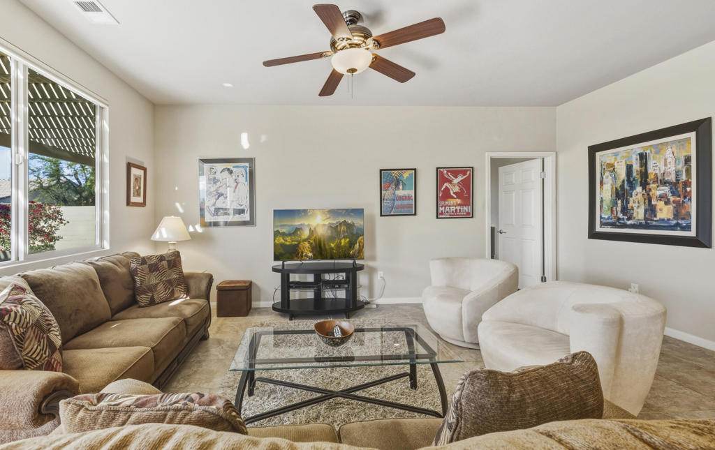 Don’t miss this beautifully maintained, Turnkey Furnished, ”Cordoba” model located on a cul-de-sac in phase 3 of Sun City Shadow Hills. This contemporary 2 bedroom and 2 bathroom home features high ceilings with ceiling fans. It has an open kitchen with granite slab counters, pull-out shelving in cabinets, stainless steel appliances, 4 burner gas stove, newer refrigerator and microwave, under cabinet lighting and a pantry. There is tile flooring throughout most of the home with quality carpeting in the bedrooms. The great room and dining area, conveniently adjacent to the kitchen, look out to the rear yard. The large primary bedroom suite has a bathroom with granite counters, dual sinks, enclosed stall shower and large walk-in closet. The guest bedroom with privacy is located away from the primary bedroom, and the guest bathroom has granite counters, tub/shower and a linen closet. There is a large laundry room with front loading washer & dryer, with stands, a deep sink and plenty of storage that lead out to the garage with a tankless water heater. Enjoy the desert lifestyle while entertaining under the custom, covered, expanded patio and built-in BBQ. The meticulously landscaped large rear yard with fruit trees has views and plenty of room for a pool too! Shadow Hills is an ”active 55+ lifestyle community” featuring 2 golf courses, 2 fitness centers, 2 clubhouses, 2 outdoor pools/spas and one indoor pool/spa, pickleball courts, tennis courts, bocce ball courts, billiard room, a ballroom, restaurant and numerous clubs and activities! Internet is also included in the low HOA dues. Don’t miss this Great opportunity!!!Home is being sold Turnkey with some exclusions…