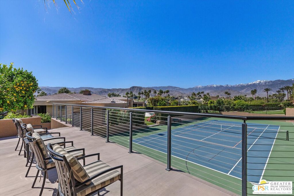 HUGE price reduction and immediate occupancy to personalize in time for this season. The gourmet Spectrum kitchen, designed for both culinary artistry and grand entertaining, boasts meticulous detailing, including dual islands, double ovens/cooktops, and a thoughtfully integrated coffee and beverage bar, creating a focal point for family gatherings. This ultimate hide and reveal retreat perched like a well-earned trophy inside this exclusively gated “lucky seven” residences of Big Sioux. A masterpiece of design and privacy, this sanctuary is strategically positioned between the iconic Annenberg Sunnyland’s estate and Tamarisk Country Club in Rancho Mirage. The expansive single-story zoned layout, encompassing 8,145 sq. ft. residence epitomizes luxury living while its thoughtful design offers an abundance of space and high-end amenities including six bedrooms and nine bathrooms. This Custom-designed residence is well suited for showcasing the finest collections of art, sculpture and automobiles. Meticulously designed for both grand entertaining and intimate living, while providing a stunning backdrop for creating lasting memories. An open-plan design creates a harmonious flow between indoor and outdoor living areas, defining this exceptional residence. The main living space is a showcase of architectural detail, featuring a magnificent, coffered ceiling with soft, ambient lighting. Expansive floor-to-ceiling windows maximize natural light and offer breathtaking panoramic views of the tranquil 1.39-acre estate. This private oasis includes a golf practice area with massive green with 2 hit pads and 3 sand traps, night-lit tennis court with a VIP viewing deck, a play area, and a shimmering pool/spa sundeck framed by dramatic mountain views. A sophisticated traditional contemporary aesthetic defines the home’s decor, highlighted by a calming neutral color palette. The adjacent media and game room offers a versatile space for entertainment and relaxation, further emphasizing the home’s seamless blend of style and functionality. An impressive circular drive, featuring a pyramid-topped porte-cochere, welcomes guests with a dazzling approach, transitioning to a covered gallery walkway that leads past manicured sculpture gardens to the grand entry hall and dining room. The dining room, equipped with built-in service facilities, is enhanced by a dramatic fireplace, creating a captivating focal point for entertaining. Thoughtfully hidden directional doors provide the option to discreetly isolate the private bedroom suites wing during larger events, balancing public and private spaces. The great room, a symphony of space and light, serves as the home’s central gathering area, featuring a wet bar with seating for six, a game table area, a media lounge with a warm fireplace, and a lit display wall, offering the perfect setting for a grand piano. A haven of tranquility, the delightfully detailed home office overlooks the sculpture garden and double-door entry leads to the dual primary suites, creating a private retreat. These luxurious quarters include an owner’s lounge with a kitchenette, a flexible space for a nursery or wellness studio, a secondary laundry, a walk-in wardrobe, and private facilities. The property unfolds into a series of enchanting outdoor living spaces, where a family room with a large-screen television, a built-in barbecue, and a large fire pit invite gatherings and quiet moments alike. These spaces offer sweeping panoramic views of the verdant landscape, crafting a picturesque haven for morning coffee or tranquil contemplation. The property features an impressive, oversized four-car tiled garage, complemented by two additional stalls and a motor court. An adjacent service and/or catering entrance provides convenient access, while a deluxe staff suite, complete with a fireplace, offers comfortable accommodation. Designed by Holden and Johnson Built by Van Fleet and features Owned Solar too!