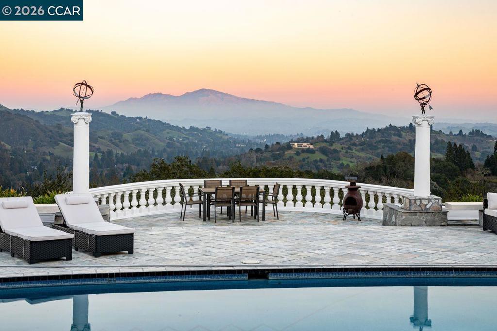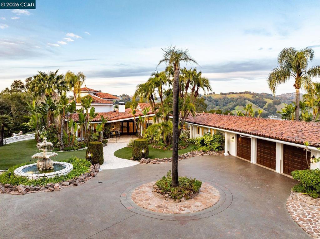 Secluded in the hills of Upper Happy Valley, this Mediterranean villa is a private world of resort-style living, amid landscaped grounds framed by sweeping Mt Diablo views. The estate feels worlds away, yet is minutes from downtown Lafayette. Walls of glass frame panoramic mountain vistas. The elegant bar room evokes a club’s ambiance. The dining room, with a beamed ceiling and seating for up to 12, flows into the rotunda, a room ideal for cocktail gatherings. Nearby, a spiral staircase leads to an impressive office suite, with 4 chandeliers, windows on 3 sides and Mt Diablo views. The chef’s kitchen offers elite appliances, custom counters, fine cabinetry and a breakfast nook. The family room features a 7×12-foot projection screen. The principal suite commands sweeping views of the deck, pool and Mt Diablo. Another bedroom is a second principal suite, secluded for privacy. One of the 2 additional bedrooms opens directly to the garden: fountains, tropical landscaping, a sport court and massive deck. The adjacent guest house can be used as a yoga studio, gym, or bedroom suite. The outdoor bar seats 6 beside a DCS grill, and a hot tub is in a secluded deck corner. The tile roof is beautiful and fire resistant, and the fire station is just down the hill.