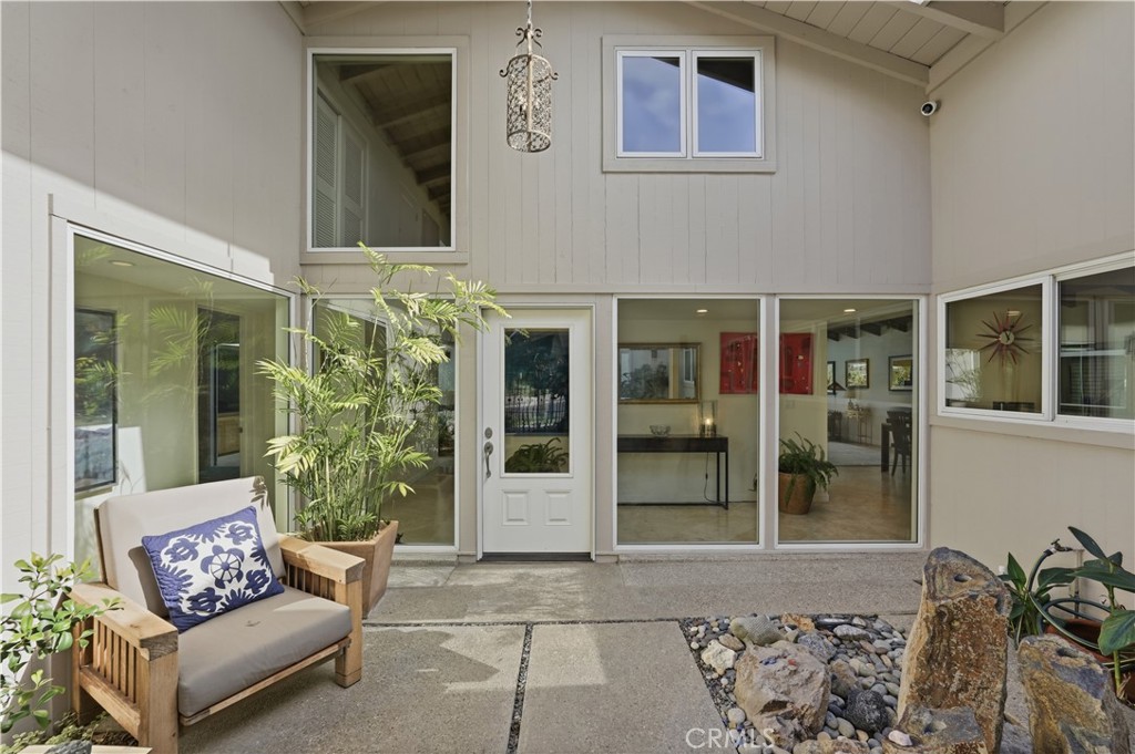 Tucked behind gates in the prestigious Virginia Country Club area of Los Cerritos, this stunning Mid-Century Modern retreat blends architectural character with thoughtful modern upgrades and golf course views. A private atrium welcomes you at the front entry, creating a tranquil first impression with fountains and greenery. The home offers a serene backdrop of lush grass, a community pool and in the distance the 14th fairway of Virginia Country Club, creating a rare sense of privacy and tranquility. Inside, walls of glass and multiple skylights flood the home with natural light, enhancing the open, airy design. The showpiece media room features a retractable roof, allowing you to open the space to the sky and enjoy the sound of birds and trees blowing in the wind – an extraordinary indoor-outdoor living experience. The gourmet kitchen is equipped with top-of-the-line appliances, sleek cabinetry and premium finishes, ideal for both everyday living and effortless entertaining. The living room shows off her fireplace and offers a warm and cozy retreat with sliding glass doors that open directly to the backyard, creating another indoor-outdoor setting perfect for relaxing evenings around your firepit or gatherings with friends at the built-in BBQ. A unique architectural highlight is the converted attic, thoughtfully transformed into an upstairs living space featuring an additional en-suite bedroom and bath. This level also includes a second viewing area overlooking the media room below, adding both flexibility and a striking architectural perspective. The 3082sqft floorplan boasts 3 bedrooms, 4 total bathrooms and a bonus room left to be used anyway you need it. Set in one of Long Beach’s most sought-after neighborhoods near Virginia Country Club, this gated Mid-Century Modern beauty offers a rare blend of privacy, character and golf course living in the heart of Los Cerritos.