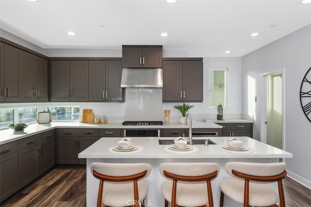 MODERN LUXURY WITH PANORAMIC VIEWS — Welcome to this beautifully designed corner home in the heart of Tustin Legacy, offering over 2,200 SQFT of open living space and some of the best park and mountain views in the community. With only one shared wall and abundant natural light throughout, this residence feels both private and spacious. The versatile floor plan includes 4 bedrooms and 3.5 baths, highlighted by a first-floor bedroom with an en-suite bath—ideal for guests, in-laws, or a dedicated home office. The main level features an expansive great room with soaring windows and a chef’s kitchen complete with quartz countertops, stainless-steel smart appliances, a large center island, and a covered balcony perfectly framing the park and hangar views. Upstairs, the primary suite is a true retreat with oversized windows capturing sweeping vistas, plus a spa-inspired bath and generous walk-in closet. Two additional bedrooms complete the top floor, each designed with comfort and style. Located in the desirable Levity Community, residents enjoy access to resort-style amenities including a sparkling pool, spa, and BBQ area. Just steps from Victory Park, The District at Tustin, top-rated schools, and minutes from freeways, this home blends luxury living with everyday convenience.