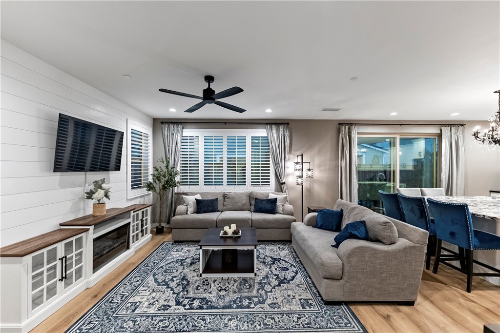 Owned solar included in this beautiful Tuscan-style 3 bedroom, 2.5 bath two-story home located in the highly desirable Tesoro Viejo community offering comfort, efficiency, and an ideal layout for entertaining. This type of floor plan was recognized with a Gold Nugget Award for its exceptional design and livability. As you walk in, you’re welcomed into a cozy living room featuring a shiplap accent wall and durable scratch-resistant laminate flooring. The space flows seamlessly into the kitchen, where an extended countertop island, black soapstone countertops, black backsplash, a double oven, and smart app-connected appliances create a sleek and functional gathering space. From the kitchen, the extra-long sliding door brings in natural light and opens directly to the backyard. Step outside to a professionally finished backyard highlighted by a custom pergola, flagstone patio, and fountain a private and inviting setting to relax or host gatherings. While the yard is low-maintenance, Tesoro Viejo’s parks, trails, dog park, and open community spaces extend your outdoor lifestyle. Upstairs features fully upgraded carpet throughout and a spacious primary suite with a redesigned custom closet, accent wall, and blackout window covering for added privacy. Plantation shutters, a tankless water heater, EV charger setup, and garage ceiling storage add everyday functionality. Well maintained and move-in ready in one of the area’s most sought-after communities.