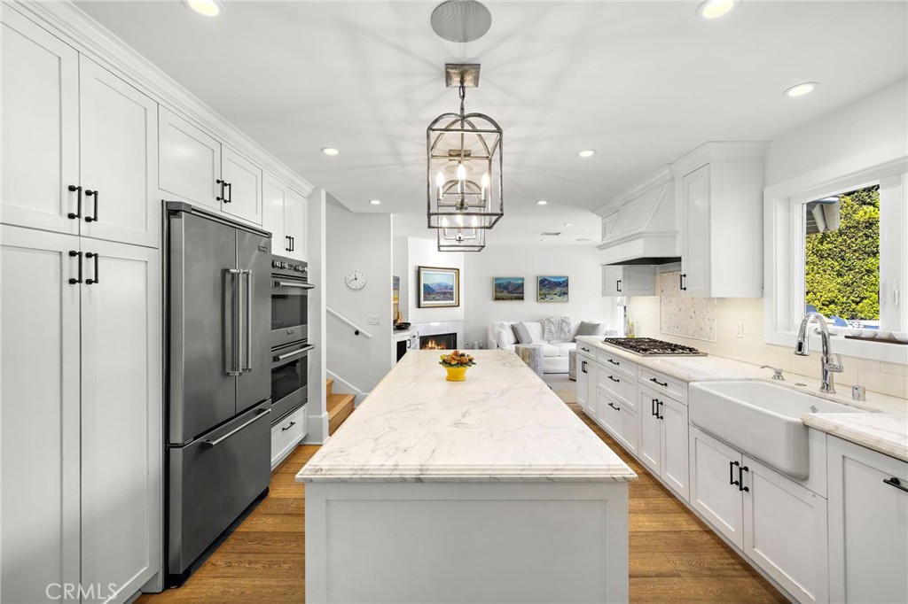 Idyllic beach home in coastal Corona Del Mar. Situated in the Corona Highlands community featuring private access to Shorecliffs beach. Light filled floor plan exudes coastal excellence in living. Custom Dutch door front entry leads into the open concept living, dining and kitchen spaces. The Chef’s kitchen is complete with Farmhouse sink, custom shaker cabinetry, Viking stainless steel appliances and Calcutta marble countertops with large island and bar seating. A dedicated dining room accommodates every type of gathering and French doors provide a connection to the rear yard. An adjacent den with fireplace is a wonderful retreat space. Gas burning fireplaces in the living, den and primary suite add to the warm ambiance of this home. This thoughtful floor plan can live mostly on one level with a main floor primary that is spacious in size, featuring en suite dual vanity bathroom with separate tub, shower and walk-in closet. The additional bedroom on the main level has a convenient adjacent bathroom off the hall with shower / tub. The second level primary suite is generous in size and amenities, featuring two closets, built-in dresser drawer cabinetry, French doors to private balcony and beautiful marble bathroom with separate soaking tub, walk-in shower. Sunset skies are enjoyed from this upper level. Outdoors, the rear of the property has been completely re-invented with custom saltwater pool, hardscape and blooming landscape. Wonderful entertaining space complete with built-in barbecue, refrigerator, firepit, stone seating and television, all the while private surrounded by green hedging. A front grassy yard surrounded by white picket fence provides a private raised yard area set up from the street. Updated systems of central air conditioning, furnace, tankless water heater, electric panel, grounded wiring and many of the dual paned vinyl windows. Additional amenities include French oak flooring, built-in speakers, recessed lighting and dedicated laundry room with new washer and dryer. Sizeable two-car garage with storage cabinetry and electric car charger. Close proximity to the vibrant Corona Del Mar village with fine dining, comfortable cafes, shops, services and ease of access to award winning schools, parks, John Wayne Airport and Fashion Island shopping.