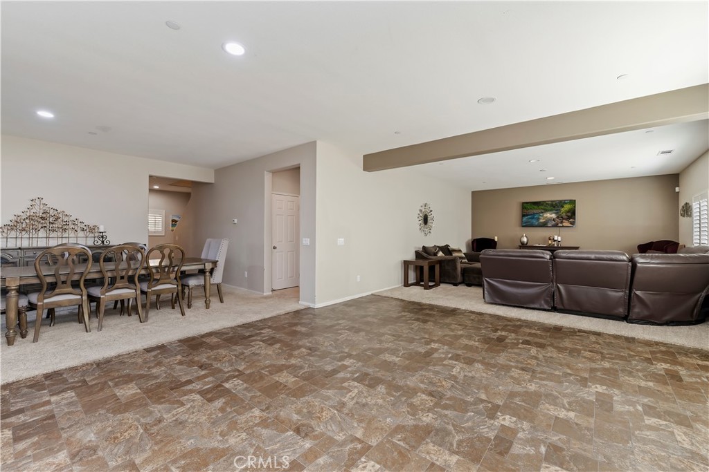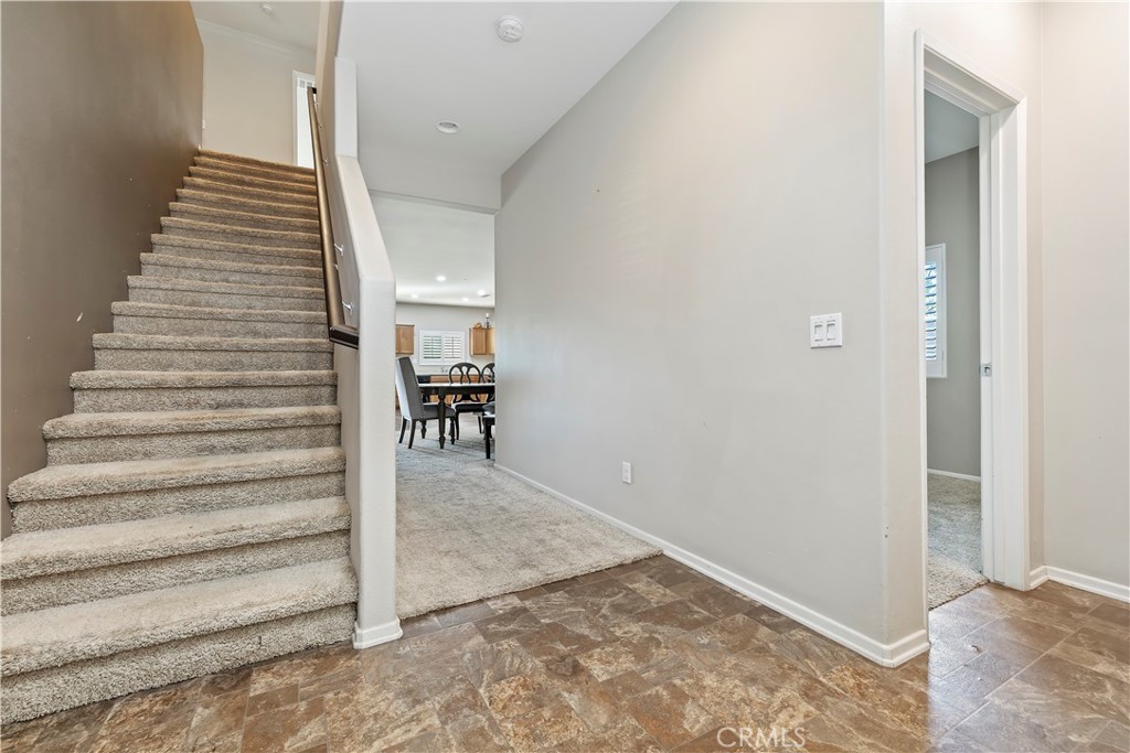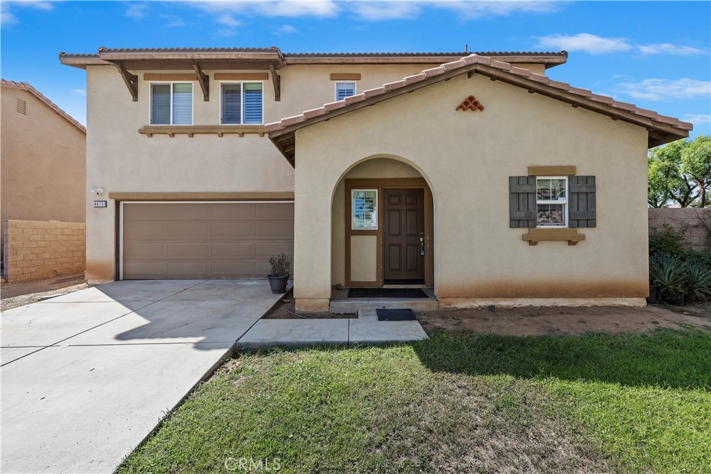 Welcome to this spacious 5-bedroom, 2.5-bath home. The interior features designer custom paint, plantation shutters, and recessed lighting throughout. The main floor offers 9-foot ceilings, an oversized family room, open kitchen with dining area, and a private bedroom with full bath. Upstairs includes a versatile loft, laundry room, and three secondary bedrooms—two with walk-in closets. The primary suite boasts a large walk-in closet, dual sinks, and a relaxing retreat atmosphere. The backyard is complete with a paver patio, block wall enclosure, and unobstructed mountain views with no neighbors on one side. Additional builder upgrades include ceiling fan kits, sprinkler systems, a fumigation system, and a tankless water heater. Conveniently located near new parks, schools, and freeway access and no HOA.