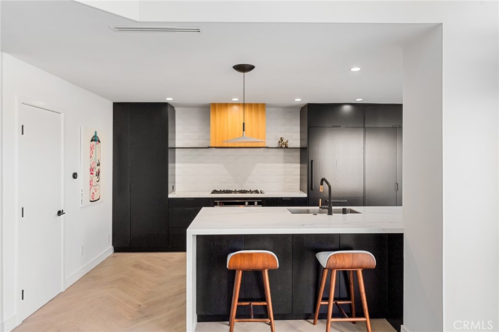 Fully Remodeled Rancho San Joaquin Modern Townhome allows you to step into unparalleled sophistication with this meticulously remodeled 3-bedroom, 2.5-bathroom townhome, completed in 2022. With bespoke modern architectural design and luxury finishes, this home redefines contemporary living. The heart of the home features designer kitchen complete with custom millwork of hand selected oak veneer cabinetry, large panoramic porcelain-covered island with stunning waterfall edges, a convenient breakfast counter, and appliances from Fisher Paykel and Bertazzoni. This space seamlessly flows into the great room, adorned with a massive gas fireplace encased in slab porcelain. Enjoy the expansive living with a great room, which opens to a large private outdoor courtyard – perfect for entertaining or relaxing in privacy. The herringbone wood flooring extends throughout the main level, enhancing the modern aesthetic. A versatile guest bedroom or office features sliding glass doors that open to a private front courtyard. The upper level boasts a custom glass and metal staircase leading to an incredible master suite and a third bedroom, each with its own private bath. The master bath is a true gem, featuring floor-to-ceiling slab porcelain walls, a standalone tub, real walnut vanities, and walk-in shower with rainhead and shower wand. The upstairs guest bath also includes a walk-in shower with a floor-to-ceiling tile surround. Luxury touches abound throughout the home, including a level 5 drywall finish, light and bright ambiance, built in shelving with undermount led lighting, coffee bar, cabinet pull outs, designer chandelier in stairwell, thoughtfully designed quartz ledges on all windowsills, and electric blinds. For your furry companions, the laundry area includes a large DOG WASH station! This is one of the rare units in the complex offers direct access to a fully finished two-car garage, complete with floor coating, a 220V outlet for electric vehicles and built-in shelves. New A/C unit placed in January 2025! Furnishings negotiable at close of escrow. The craftsmanship of this remodel was masterfully completed by One Contracting and Remodeling LLC with custom millwork cabinetry by CabinetsOC.