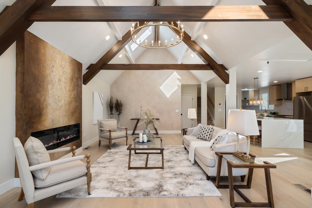 This Berkeley Hills Tudor has been transformed into a light-filled, modern retreat that seamlessly blends old-world charm with contemporary elegance. The top-to-bottom remodel has elevated the property to a true oasis, overlooking the treetops and Berkeley skyline. As you enter, the soaring skylit ceilings and hand-hewn beams create an inviting, old-world ambiance, while the hand-painted palette of soft naturals unifies the open-space design. The living room features a sleek, modern fireplace, while the 8-foot chef’s kitchen island with a stone waterfall counter and the expansive dining space with floor-to-ceiling windows and doors that open to a 560-square-foot wrap-around deck, create a harmonious flow throughout the main living areas. The main floor boasts a bed-and-bath suite with a spa-like bathroom, complete with a seamless, walk-in steam room shower and heated floors. Upstairs, three more bedrooms are uniquely laid out for maximum privacy, including an en-suite primary suite with a walk-in closet and its own indoor-outdoor connection to a private rear yard. Downstairs, a separate-entry integrated ADU offers additional living space, with a living room, bedroom, kitchenette, and a luxury bath, providing flexibility and independence for guests or tenants.
