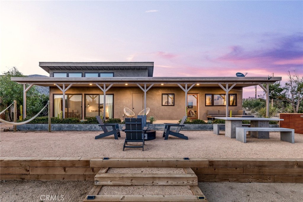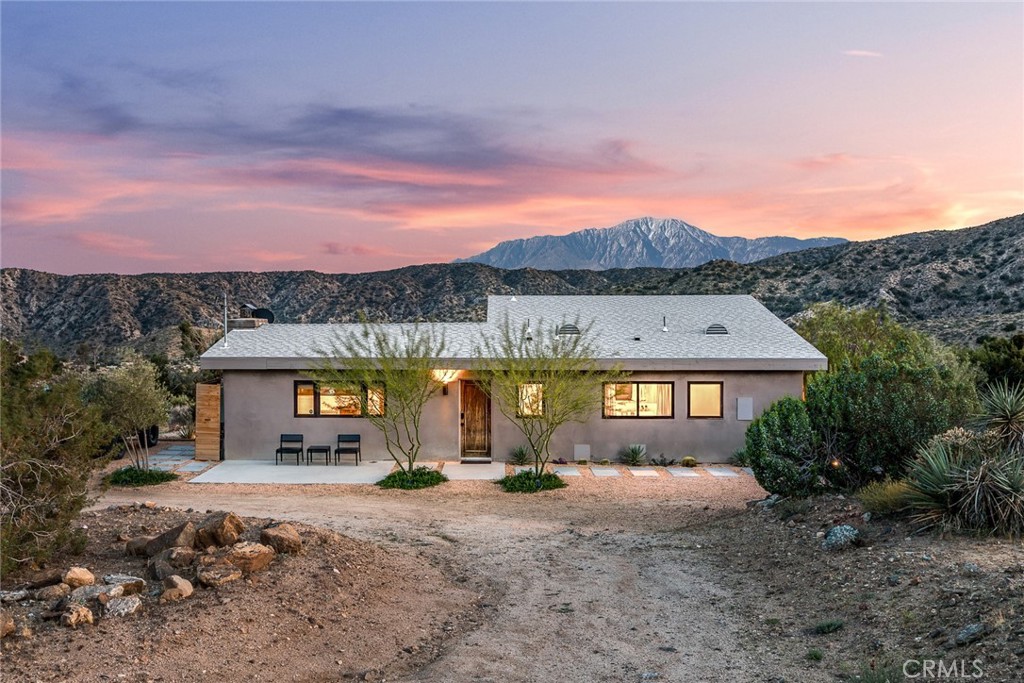 Dramatic mountain views envelop you from all directions in this artist-designed mid-century retreat spanning 5 serene acres under the majestic backdrop of Mt San Jacinto. The original 1959 brick cabin serves as an open concept living & dining area with soaring exposed beam ceilings, a cozy wood burning fireplace, built-ins, and a modern kitchen complete with quartz countertops, new copper plumbing, and a clever hidden under-counter fridge. A thoughtfully curated 2022 renovation introduces a chic new primary bedroom, oversized bathroom, bonus sleeping loft, and mini splits for climate control. The generously sized bedroom features a walk-in closet and built-in office nook, punctuated by a wall of glass sliders inviting you to take in the striking outdoor panorama. Down the hall you’ll find a hidden stackable washer & dryer and a spa-like bathroom with venetian plaster, dual sinks, a soaking tub, a shower room, and a separate water closet. A ladder opens to a secret upstairs 300 sq ft sleeping loft with more impressive views, making a delightful guest bunk or a quirky clubhouse for the kids. A 384 sq ft covered outdoor patio spans the rear of the home, leading to an open-air lounge and dining area with a gas grill, propane fire pit, and built-in hammocks to unwind under the stars. Follow the professionally landscaped path down to the most instagrammable moment of them all – a bespoke wooden bathhouse where 2 vintage clawfoot tubs beckon you to enjoy a hot soak framed by yet another incredible view. An original 1968 Silver Streak trailer sits on the side of the property, serving as a fabulous potential guest space, clubhouse, or home office. Ideally situated less than 2 hours to LA, 15 minutes to Palm Springs, 20 minutes to Joshua Tree National Park, and surrounded by 154,000 acres of publicly accessible canyons, preserves, white waters, trails, and mountain peaks of the Sand to Snow National Monument, this property is the perfect home-base for everything from romantic getaways to family adventures. Sold turnkey so you can grab your suitcase and move right in, or take over the “guest favorite” airbnb account to start generating short term rental income right away. An adjacent buildable 5 acre parcel is available to purchase separately to create your own 10-acre multi-parcel dream compound.