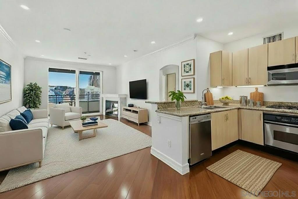 Top-floor residence at Park Blvd West featuring a rare PRIVATE ROOFTOP DECK with stunning downtown skyline views! This home offers an outdoor setup rarely found in East Village: a massive private roof deck plus a second balcony off the main living area. Inside, the split 2BR/2BA floor plan provides ideal privacy, with bedrooms separated by a bright, open living space refreshed with new paint, new recessed lighting, and brand-new carpeting. Hardwood floors anchor the main living areas, while the kitchen features clean modern cabinetry, granite counters, and stainless steel appliances. The living room is designed for real living, offering great wall space for art or media, a cozy fireplace, and sliding doors for effortless indoor-outdoor flow. Upstairs, the rooftop deck is your personal urban escape—perfect for entertaining, fitness, or pets under the city lights. The primary suite includes a walk-in closet and en-suite bath with dual sinks. Notable essentials include in-unit laundry, central HVAC, and two coveted tandem parking spaces in a secure gated garage. Located just steps from Petco Park, the Trolley, and the best of downtown San Diego.