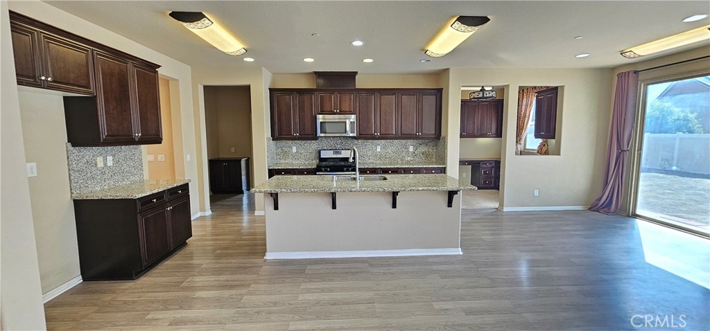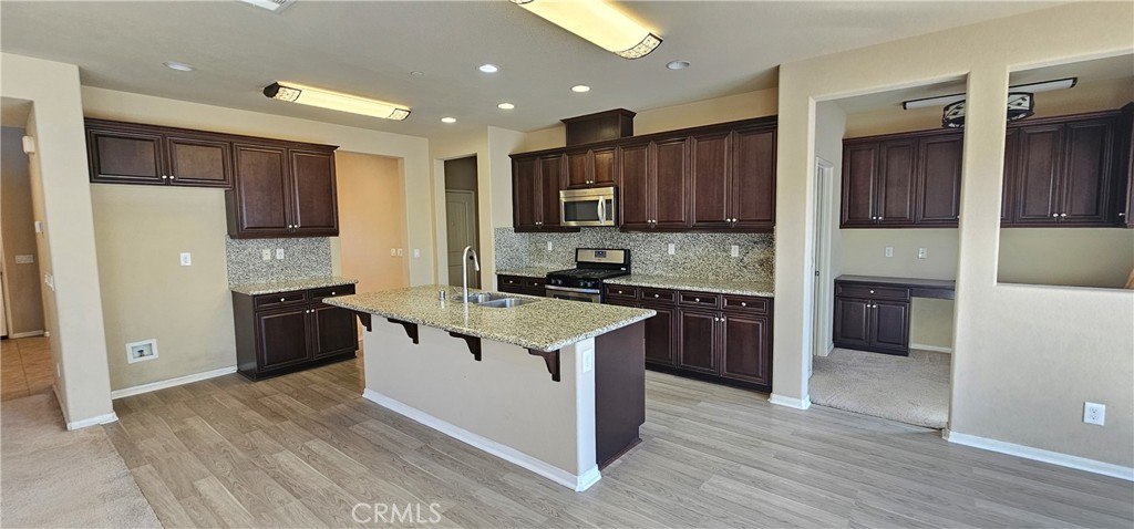 Welcome to this spacious and beautifully maintained six-bedroom, five-bath home located in the highly desirable city of Eastvale, California. This stunning two-story residence combines comfort, elegance, and modern design in one of the area’s most family-friendly neighborhoods. The home welcomes you with an open and airy floor plan featuring large windows, elegant lighting, and warm natural tones throughout. The kitchen is a centerpiece, offering granite countertops, rich cabinetry, stainless steel appliances, and a large island that overlooks the dining and living areas. Sliding glass doors lead directly to the backyard, allowing sunlight to fill the space and creating a seamless flow for indoor and outdoor living. Downstairs includes a full master suite—perfect for guests or multi-generational living—while the upstairs features a second master suite along with additional bedrooms and bathrooms. A spacious loft area provides flexibility for a family room, home office, or entertainment space. Each bathroom is tastefully designed with modern fixtures, bright lighting, and clean finishes. The backyard is private and open, complete with a paved patio path, palm trees, and a storage shed, offering plenty of room for gatherings, gardening, or simply relaxing. The attached two-car garage provides ample space and includes shelving for easy organization. The laundry room is conveniently located and ready for washer and dryer hookups. Pets are not permitted. This home is conveniently located near top-rated schools, parks, shopping centers, and major freeways for easy commuting. With its generous space, bright atmosphere, and thoughtful design, this Eastvale property offers the perfect balance of comfort, privacy, and convenience—an exceptional place to call home.