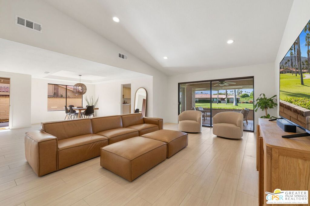 Wow! Designer-finished from top to bottom, this single-level home at Chaparral Country Club offers panoramic mountain, greenbelt, and fairway views. A rare enclosed side yard, quiet cul-de-sac setting, and proximity to the pool add to the appeal.Vaulted ceilings and a dramatic brick fireplace define the living space, while an open-air atrium with Plinth fountain brings natural light and architectural character. The remodeled kitchen features a Bertazzoni stainless steel gas range, new appliance suite, and quartz countertops, all opening to a covered terrace for indoor-outdoor living.Three ensuite bedrooms are arranged with excellent separation. The primary retreat includes a resort-style bath with soaking tub, walk-in shower, dual vanities, and custom walk-in closet. Guest suites offer atrium access or side-yard views. Additional highlights include tile flooring throughout, a new energy-efficient HVAC system, in-ground safe, and paid assessment for a new roof.Chaparral Country Club amenities include an 18-hole Ted Robinson Sr. designed golf course, 21 pools and spas, tennis and pickleball courts, fitness center, and a clubhouse with dining and lounge. Fee land (you own it).