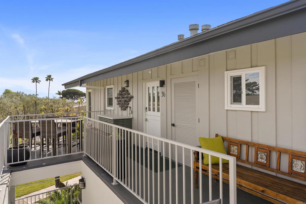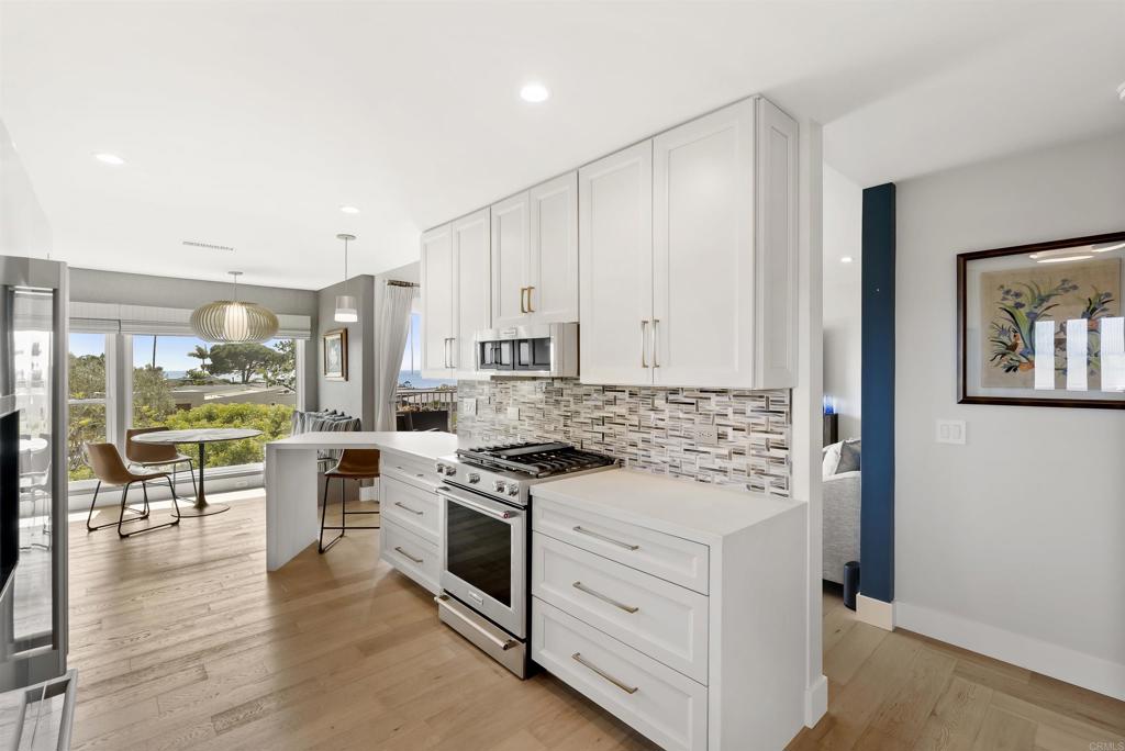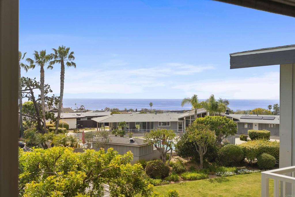 STUNNING LOCATION! Rare top-level end unit, this single-story luxury penthouse in Park Del Mar offers breathtaking panoramic ocean views. Completely remodeled from top to bottom with premium finishes, the home features custom folding glass doors that open seamlessly to your private patio, perfect for enjoying uninterrupted ocean breezes and spectacular sunsets. The open-concept floor plan showcases vaulted ceilings, beautiful wood flooring throughout, and abundant natural light. The residence offers 2 bedrooms and 2 full baths, thoughtfully designed with exquisite, spa-inspired finishes. The gourmet kitchen is equipped with top-of-the-line KitchenAid appliances and a Bosch refrigerator, ideal for both everyday living and entertaining. A full-size washer and dryer are conveniently located within the unit. Additional highlights include a nearby covered carport plus an additional open parking space for a second vehicle, as well as a storage unit. The home also overlooks a tranquil greenbelt with a park-like setting. Residents enjoy resort-style amenities including a pool, sauna, and spectacular ocean-view clubhouse featuring a kitchen, showers, changing areas, ping pong, shuffleboard, and more. Ideally located just minutes from the beautiful beaches of Solana Beach, Del Mar, and Encinitas, as well as outstanding restaurants, shopping, and the world-famous Del Mar Racetrack.