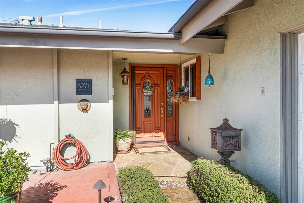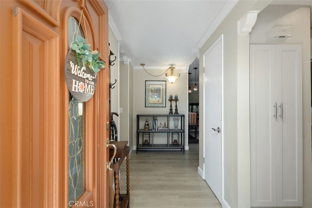 Prestigious beach home, situated on an over sized interior corner lot, while offering excellent curb appeal. It all begins with a renovated front yard, featuring a pavers driveway plus drought resistant landscaping with a fountain, a wooden deck and a picturesque mature tree. A new vinyl fence is also in the process of being installed shortly. As you approach the entry, you are welcomed by a Flagstone front porch and a custom front door with a pocket screen. Once inside, you are greeted by a spacious formal living room, featuring a gas or wood burning fireplace, stained glass windows and French doors leading to the rear patio. The kitchen has been updated in stages with granite counters, recessed lighting, updated cabinets installed in 2014 plus 5 year old stainless steel appliances, with the refrigerator and microwave included in the sale. There is a full sized dining room adjacent to the kitchen, showcasing a large garden window. The hall bathroom has been updated with a bathtub/shower with an acrylic surround plus glass enclosure, vanity with quartz counter and travertine flooring. All of the bedrooms are nice sized and there are mirrored wardrobe closets in the primary plus 2nd bedroom. The primary bathroom offers an acrylic lined shower, vanity with quartz counter plus a travertine tile floor. There are tons of bonus features including: crown moldings, textured ceilings, newer laminate flooring, dual pane windows, a brand new water heater, newer heating, air conditioning, ducting and insulation, all installed in 2021, copper plumbing, a roll-up garage door with a quiet opener and a 30 year roof with rain gutters, installed 11 years ago. Saving the best for last, the private rear yard features a heated in ground spa with an elegant brick surround, a large covered patio area with skylights, a natural gas built-in stainless steel BBQ, a large wrap around patio with a built-in gas firepit, French drains, artificial turf, nice landscaping and a garden shed. This lovely home is also walking distance to award winning schools, a park, golf, shopping, restaurants and is less than a 5 minute drive to the beach or the Bella Terra Mall!