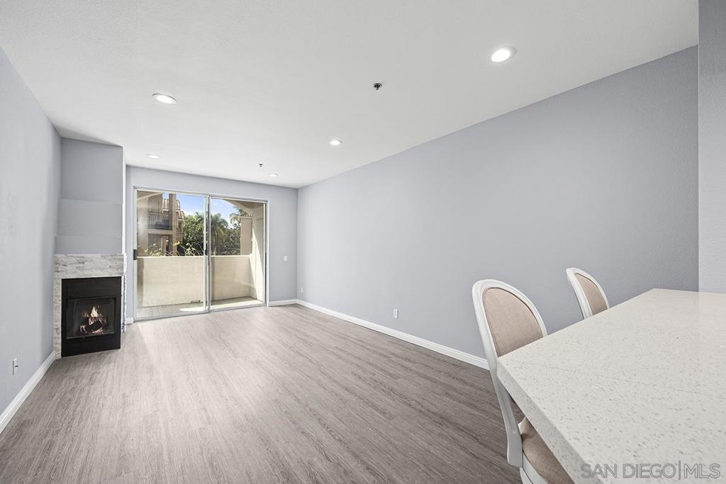 This stylishly renovated condo at Rio del Oro offers modern living in the heart of Mission Valley. Step inside to find a bright, contemporary interior featuring luxury vinyl plank flooring, crisp white cabinetry, and gleaming white quartz countertops throughout the kitchen and bath. The kitchen is equipped with stainless appliances, custom glass tile backsplash, and a convenient eat-at bar, perfect for casual dining and entertaining. The living space is warmed by a fireplace featuring a modern stacked stone façade, and abundant recessed LED lighting, creating an inviting ambiance day and night. Step out onto your private west-facing balcony with additional storage ideal for enjoying San Diego’s stunning sunsets. The bedroom is a true retreat, complete with blackout shades and a spacious walk-in closet. The bathroom features a soaker tub, updated white quartz counters, and modern finishes. An in-unit washer and dryer adds everyday convenience. This home combines stylish upgrades with an unbeatable Mission Valley location with guest parking that is near shopping, dining, freeways, and transit. Don’t miss this one! Rio Del Oro is a highly sought-after community nestled alongside the scenic walking and biking trails of the San Diego River and offers guest parking. Residents enjoy resort-style amenities including a pool and spa, fitness center, lush park-like common areas, and a private community room. The location is unbeatable: just steps from Fashion Valley Mall’s premier shopping and dining, movie theatres, and the San Diego Trolley. Everyday conveniences are right at your doorstep with Mission Valley West just a short walk away, home to Trader Joe’s, King’s Fish House, Shake Shack, Lazy Dog, and much more. This is Mission Valley living at its finest.