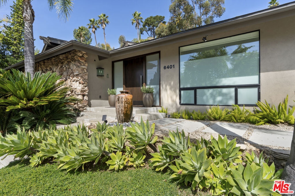 Nestled in the exclusive Lake Hollywood Estates just below the iconic Hollywood Sign, this stunning single story mid-century modern retreat offers the ultimate in Hollywood Hills living. Step inside to an expansive open-concept living space anchored by a striking fireplace, creating the perfect setting for both relaxation and entertaining. The recently updated kitchen is a chef’s dream, featuring high-end appliances, a spacious center island, and an adjacent breakfast area. A formal dining space overlooks the beautifully landscaped grounds, blending indoor and outdoor living seamlessly. Designed for entertainment and creativity, the home features a private screening room/family room equipped with state-of-the-art technology and a drop-down screen perfect for movie nights. There is also a professionally built, industry-standard sound studio, which can easily be converted into a fifth bedroom or an additional expansive walk-in closet for the primary suite. The luxurious primary suite is a true sanctuary, offering serene garden views, a cozy breakfast bar, large walk in closet and a spa-inspired bathroom complete with a steam shower and jetted tub. Three additional generously sized bedrooms and two beautifully appointed bathrooms complete the home. Truly one-of-a-kind, this exceptional property offers a rare blend of style, comfort, and versatility. An extraordinary place you’ll never want to leave.