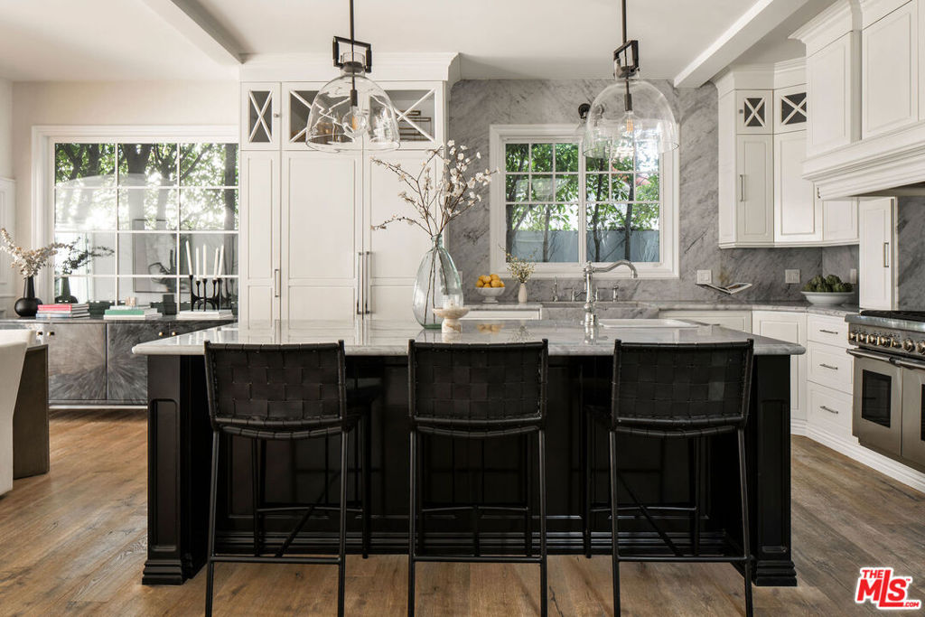 Situated in prime Beverly Grove, this warm and elegant Traditional residence offers timeless design and refined luxury living. Gated and maturely hedged for complete privacy, this beautifully curated 4-bedroom, 5-bathroom home offers inviting indoor and outdoor living spaces designed for comfort and effortless entertaining. The home features a gracious formal living and dining room alongside an open-concept kitchen finished with Statuario marble, Ann Sacks and Tabarka encaustic tiles, and custom iron-cast doors. High ceilings and distressed French oak floors throughout create a sense of warmth, character, and understated sophistication. The thoughtfully designed floorplan includes one guest bedroom on the main level and three bedrooms upstairs, each with its own en-suite bathroom ideal for comfortable family living and hosting guests. The expansive primary suite is a serene retreat, complete with a generous walk-in closet with custom built-ins and a spa-like bathroom designed for relaxation. The grand living room opens seamlessly to a lush backyard, featuring a sparkling pool, entertainer’s cabana, and a large grassy area perfect for gatherings, play, and everyday indoor-outdoor enjoyment. Ideally located moments from The Grove, Beverly Center, and Melrose Place, with close proximity to premier dining and shopping, this turnkey residence offers a rare blend of warmth, elegance, and prime city living.