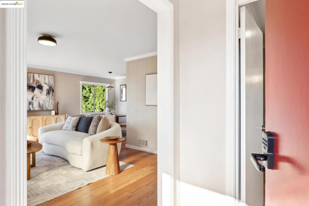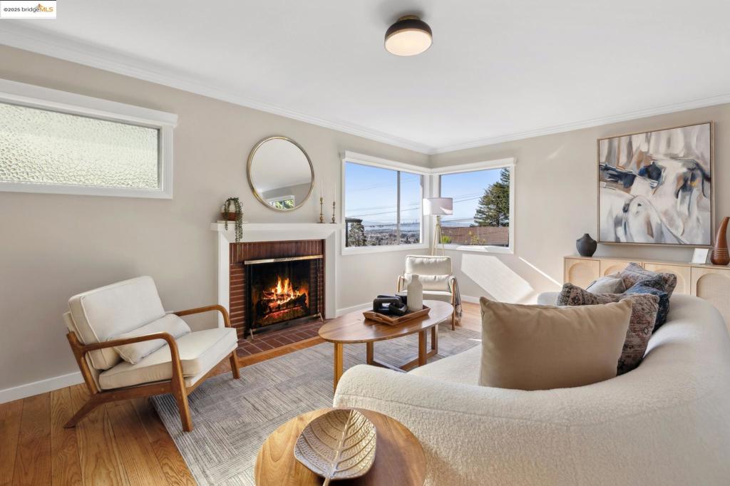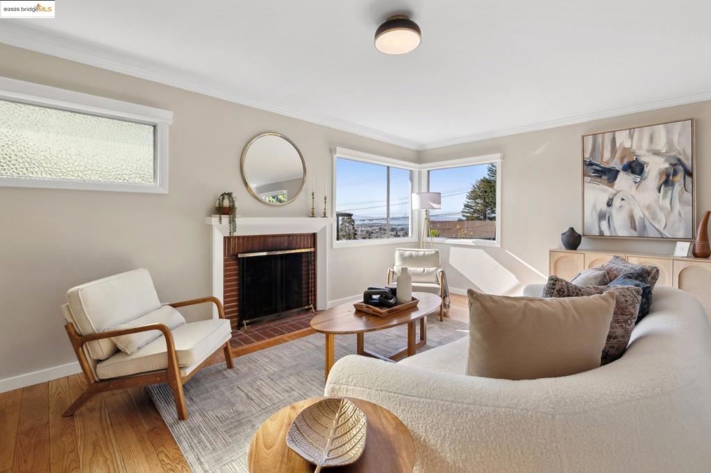 From the moment you enter this magical one-level home, you are captivated by its true Mid-Century design aesthetics. The gleaming newly refinished hardwood floors, a fabulous living room with the fireplace, that flows perfectly into the dining room offer giving you an open concept feeling- all silhouetted by views of the San Francisco skyline. The kitchen’s inspiration was drawn from five original Mid-Century tile pieces that were carefully removed & preserved from the original kitchen & creatively blended & displayed as works of art on the stove’s backsplash all with newly updated modern touches throughout to marry the two worlds, old & new, together. New cabinetry, new appliances, new tile flooring, & other modern amenities, all added to give the new owner a sense of ease. A separate laundry area just off the kitchen gives more comfort to this wonderful floor plan. The 2 bedrooms offer space and an abundance of storage with the closet’s built-in cabinets. The newly updated bathroom has a burst of fun with new lighting, new tile floors (2025), an updated vanity, and other wonderful additions. With so many possibilities your imagination can unfold & create the outdoor space you dream of. A level patio area for entertaining, a grassy area to play & a space to garden!