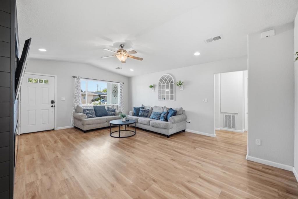 Welcome to 690 El Cerrito Way in Gilroy! This 3 bedroom, 1.5 bathroom home offers 1,420 sqft of living space on a 6,200 sqft lot with thoughtful updates throughout and no HOA. The light-filled kitchen features ample cabinetry, stainless steel appliances, and opens to a cozy dining area. The spacious living room showcases updated flooring and a modern fireplace feature wall, creating a warm and inviting atmosphere. Laminate flooring runs throughout the home. Both bathrooms have been tastefully updated, including a stylish full bath with a sleek vanity. A versatile bonus room provides the perfect space for a home gym, office, or additional living area. Bedrooms are well-sized, with unique accent walls adding character. Enjoy central A/C and solar for year-round comfort and efficiency. Step outside to a low-maintenance backyard with a pergola-covered patio, ideal for entertaining or relaxing evenings. Conveniently located near Alehouse Bar & Grill, Pineapple Village, and nearby grocery stores, with easy access to commuter routes, this home is a great blend of comfort, style, and functionality.