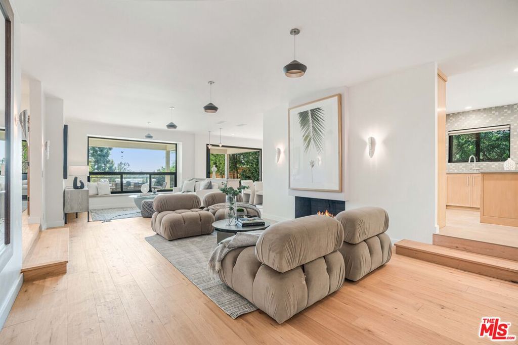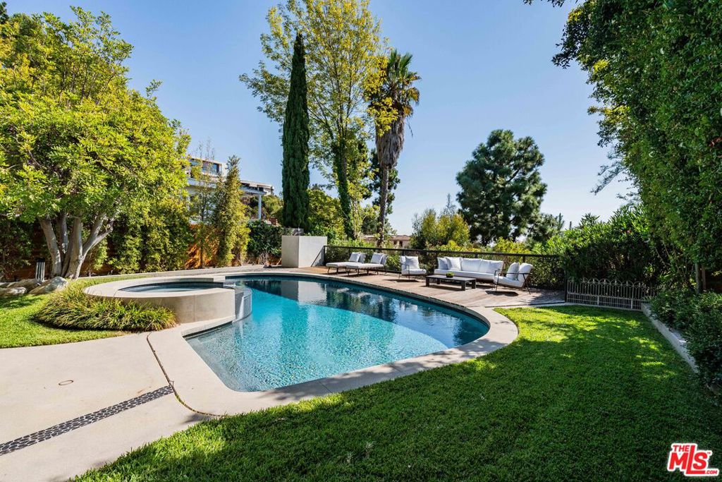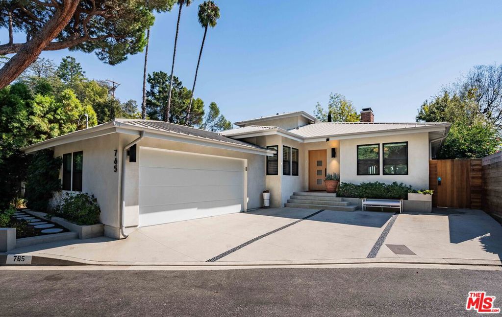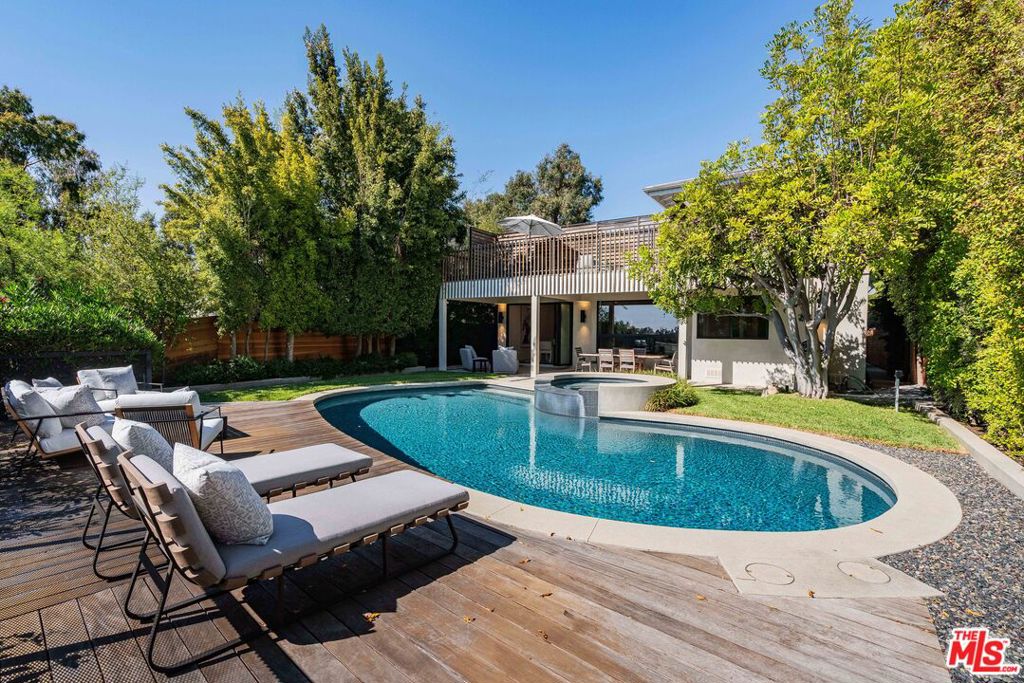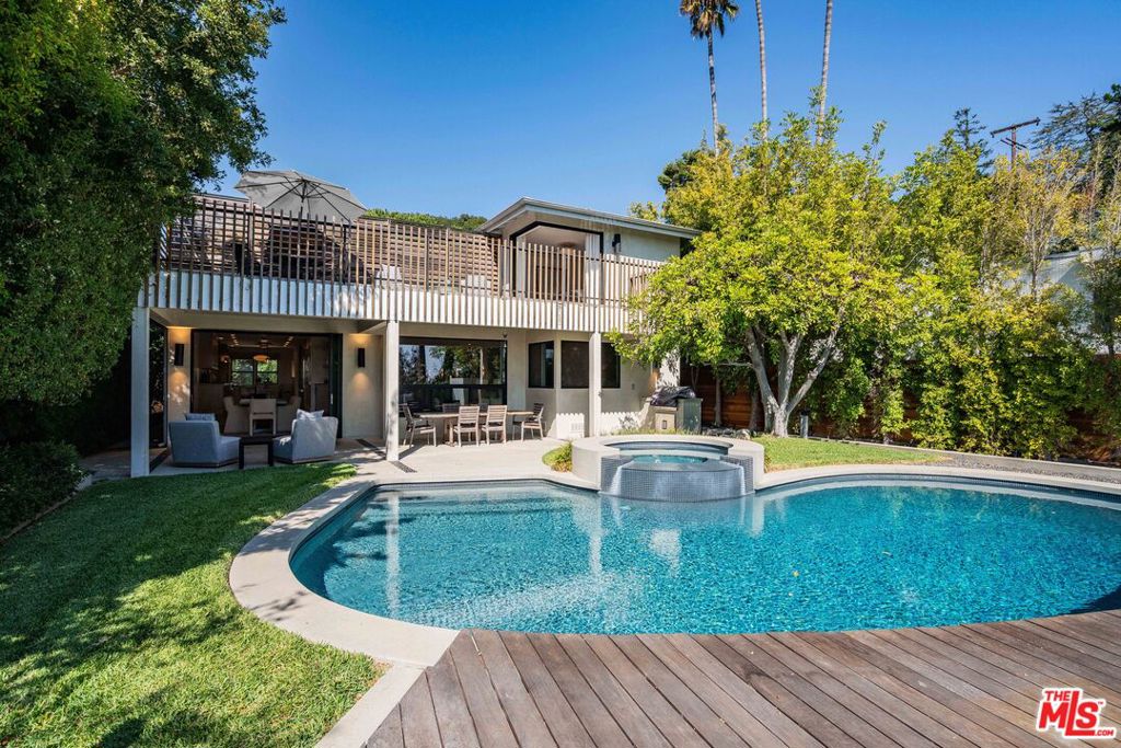 Stunning Warm Contemporary Home located on a quiet cul-de-sac in the heart of Brentwood. This turnkey residence has been completely renovated throughout with exceptional design and attention to detail. A bright open floor plan showcases a minimalist aesthetic with tons of natural light and incredible indoor/outdoor living space. Glass sliding doors lead to the spectacular backyard with beautiful ocean/city views and an oversized pool, spa, BBQ, covered patio, dining area and wood deck. The gourmet kitchen features custom tile backsplash, Caesarstone countertops, Miele and Viking appliances, custom oak cabinetry and a separate breakfast area with built-in bench. The primary suite occupies the entire second floor and includes a private deck with ocean/city views, walk-in closet and spa-like bathroom with double vanity, oversized shower and custom wrought-iron door. Other design upgrades include solid white oak wood flooring throughout, custom interior lighting design and fixtures with Lutron system, built-in camera security system and new metal roof. A beautiful move-in ready modern home on a peaceful and private cul-de-sac.