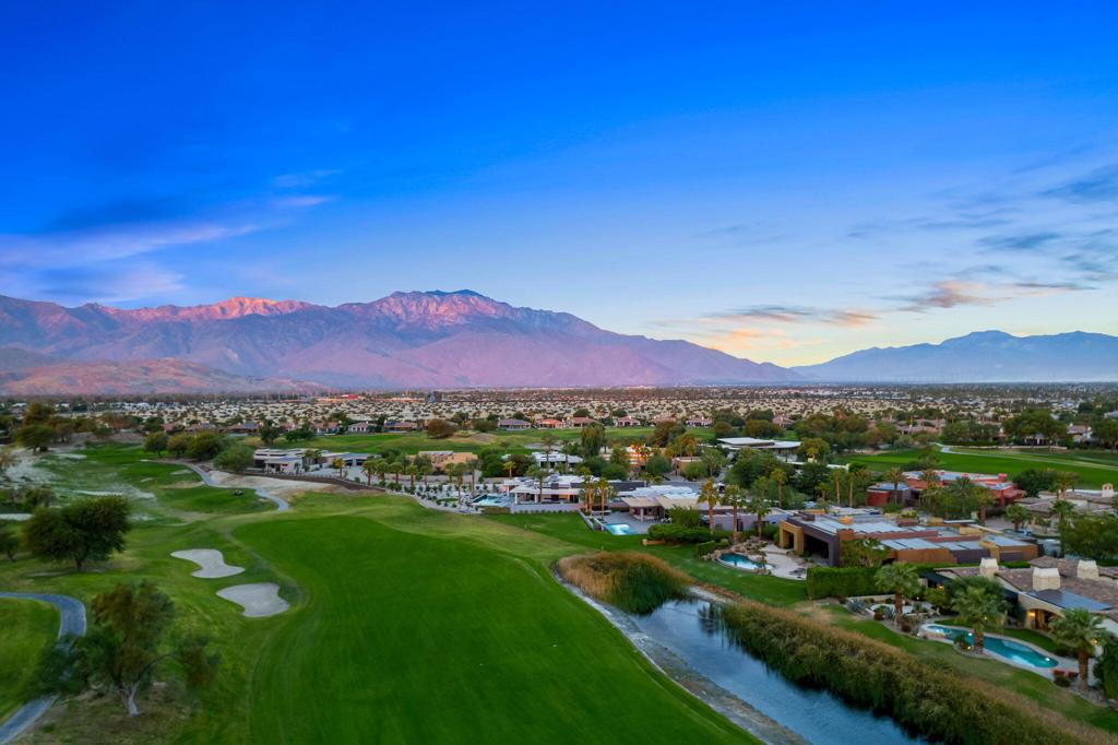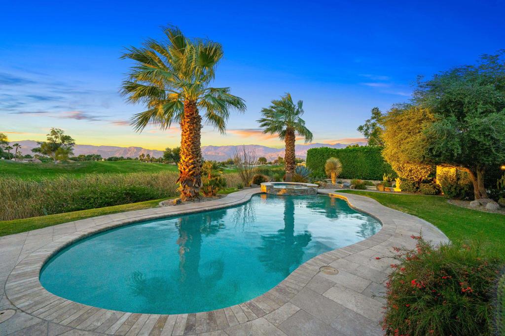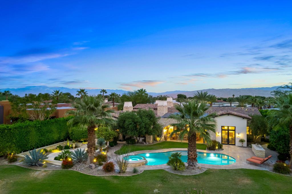 Estate In Coveted Westgate with High Quality Finishes and Santa Barbara Transitional Style. Stunning South Facing Lake, Fairway and Mountain Views on .62 Acre Lot. Great Curb Appeal with Circular Drive leading to a stone tower Welcome Hall opening to a magnificent outdoor living courtyard with fireplace and antique fountain. The main house Entry Hall leads to a dramatic Great Room with stone floors, beamed ceilings, fireplace and pocket doors to Outdoor Loggia. The Great Room is open to a Gourmet Chef’s Kitchen with handmade cabinetry, butler’s pantry/service kitchen, wine room, entertainer’s bar and a Morning Room with Views. Family/Media Room and Stunning Wood Paneled Office/Library with Fireplace. Master Suite includes Bedroom with Views and Fireplace, Marble filled Bath with dual vanities, showers and closets. Guest Bedroom with Ensuite Bath and Terrace and 2 Guest Casitas each with Fireplace and outdoor living. Outside Living includes the Private Courtyard, Covered Outdoor Living and Dining, Pool and Spa with Terrace, Built-in BBQ and Sunken Garden Terrace. Solar equipped and ready to enjoy the season. Come Home to Relaxed Elegance in Rancho Mirage!