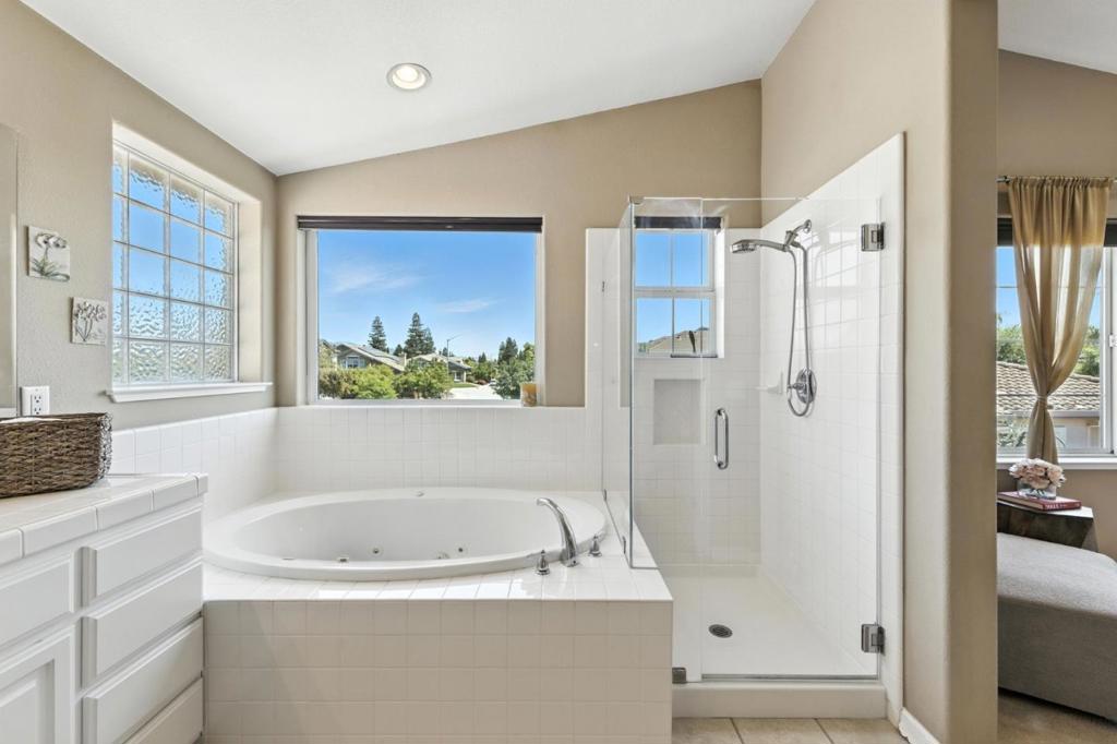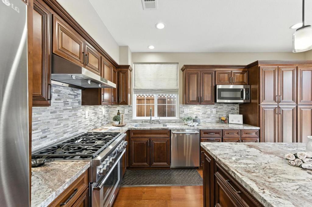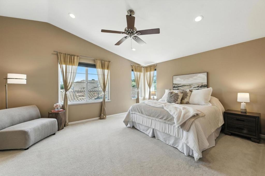 Welcome to your dream home in one of Morgan Hills most sought-after neighborhoods! This stunning residence blends comfort, elegance, and sustainability, featuring soaring 10-foot ceilings and rich engineered hardwood floors that create an airy and inviting ambiance throughout. The gourmet kitchen is a chef’s dream, boasting a premium Thermador oven, under-cabinet lighting, a modern water filtration system, and a large granite kitchen island perfect for meal prep, casual dining, or entertaining. Owned solar panels provide energy efficiency, while a brand-new air conditioning/ heat pump unit ensures year-round comfort. Step into the expansive primary suite, your personal retreat, complete with a spa-like soaking tub, separate walk-in shower, and generous closet space. Outside, enjoy the peaceful serenity of your private backyard oasis. A charming pergola draped with mature olive trees and grapevines sets the scene for al fresco dining, surrounded by vibrant rose bushes. Tucked away on a quiet, tree-lined street, this home offers tranquility without sacrificing the 10-minute walk to downtown Morgan Hill restaurants and amenities.