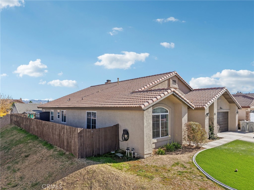 Situated on a desirable corner lot, this spacious and well-designed home offers comfort, privacy, and an ideal layout for everyday living and entertaining. The inviting living room welcomes you with laminate flooring throughout the main living areas and plush carpeting in the bedrooms. Just off the foyer is a bedroom with an en suite bathroom. At the heart of the home, the spacious kitchen features stainless steel appliances, a large center island with bar seating, and opens seamlessly to the dining area and family room. The family room is anchored by a charming brick-framed fireplace with built-in media shelving for a cozy gathering area. A sliding door leads to the expansive covered patio, offering ample room for outdoor dining, play, BBQs, and entertaining. Two additional bedrooms and a full bathroom are located on one side of the home, while the oversized primary suite is privately situated on the opposite end. The primary retreat features a slider with direct patio access, a generous walk-in closet, and an en suite bathroom complete with dual-sink vanity, soaking tub, and separate shower. The backyard is designed for low-maintenance enjoyment with artificial turf and two side yards ideal for storage or a dog run. Additional highlights include a laundry room off the kitchen with direct access to the garage. Conveniently located near schools, shopping, dining options, and with easy access to the 15 freeway, this home offers space, functionality, and a prime location.