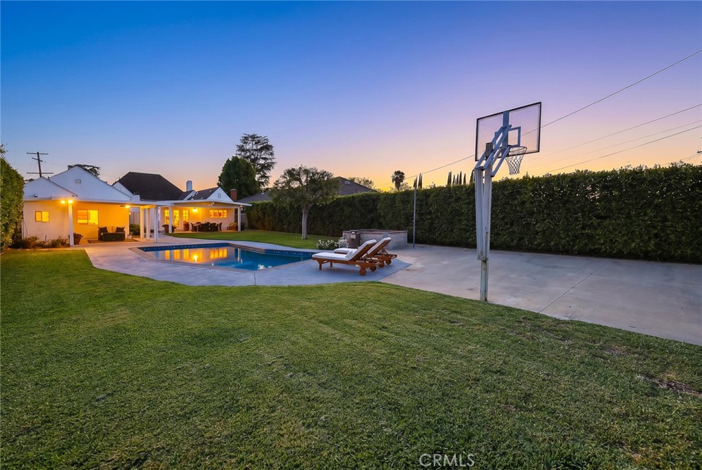 This beautifully maintained home is situated on one of the largest lots in the area, offering a rare rectangular parcel with exceptional potential for future expansion, additions, or customization. Proudly owned and meticulously cared for over the years, the sweet home showcases extensive upgrades and quality improvements throughout, and is presented in pristine, move-in ready condition. A warm and inviting formal living room welcomes you in, leading to an open kitchen featuring a center island, premium KitchenAid appliances, ample cabinetry, and generous storage space. The formal dining area sits conveniently adjacent to the kitchen and the family room, while a spacious family room opens to the backyard, creating a seamless indoor-outdoor living experience. Step outside to a beautifully constructed covered patio just off the family room—an ideal setting for outdoor dining and entertaining—overlooking the serene backyard with a sparkling pool, outdoor shower next to the pool, and even a basketball court. All three bedrooms are well-proportioned and comfortable in size. Both bathrooms have been tastefully upgraded with designer finishes, including elegant vanities, stylish tile work, and glass-enclosed showers. Additional interior highlights include solid wood flooring throughout, dual-pane windows, French doors, plantation shutters, and central A/C for year-round comfort. The home has also been freshly painted inside and out, further enhancing its clean and refined presentation. Major system and property improvements have been thoughtfully completed over time, including a newer roof, electrical, plumbing system HVAC, water heater, flooring, kitchen, pool equipment, and irrigation system, reflecting pride of ownership and long-term care. With a private laundry room, two-car garage, and a peaceful yet highly convenient location close to shopping, dining, and major routes, this property offers an exceptional blend of quality, comfort, and outstanding potential. An exceptional opportunity for both homeowners and those looking to maximize long-term value.